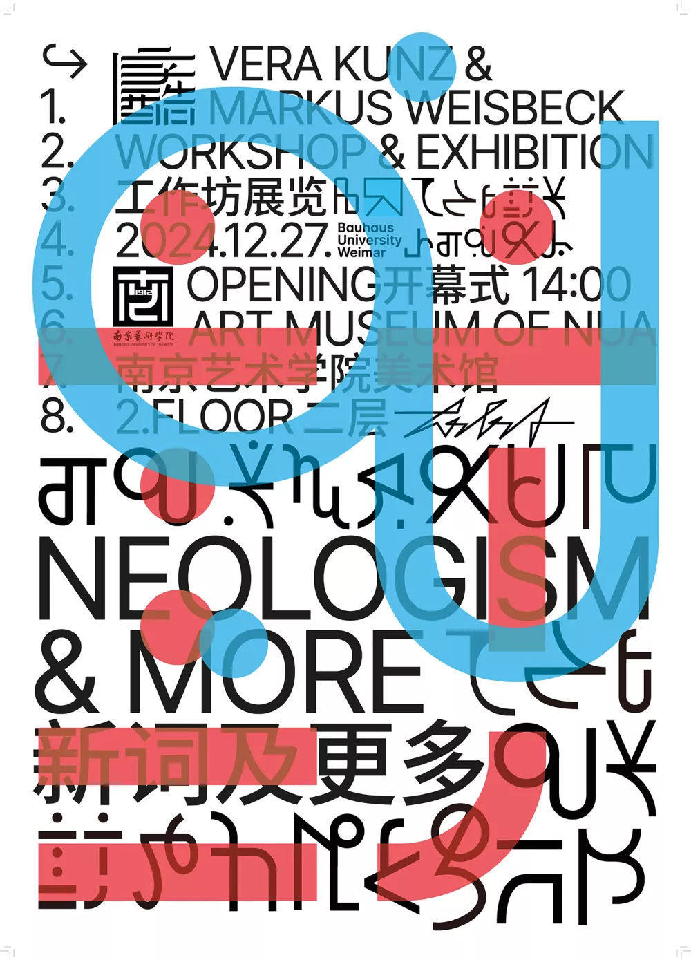 Neologisms & More ist das Thema des Space for Visual Research Workshops an der Nanjing University of the Arts im Dezember 2024. Symbole und ihre Bedeutungen im Kontext von Schrift und einzelnen Buchstaben stehen im Mittelpunkt der Untersuchung. Die Studierenden nähern sich den lateinischen Buchstaben in experimenteller Weise und entwickeln neue Formen der Inszenierung für die Präsentation. Der typografische Kontext wird dabei als offenes Element verstanden.