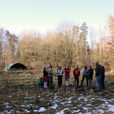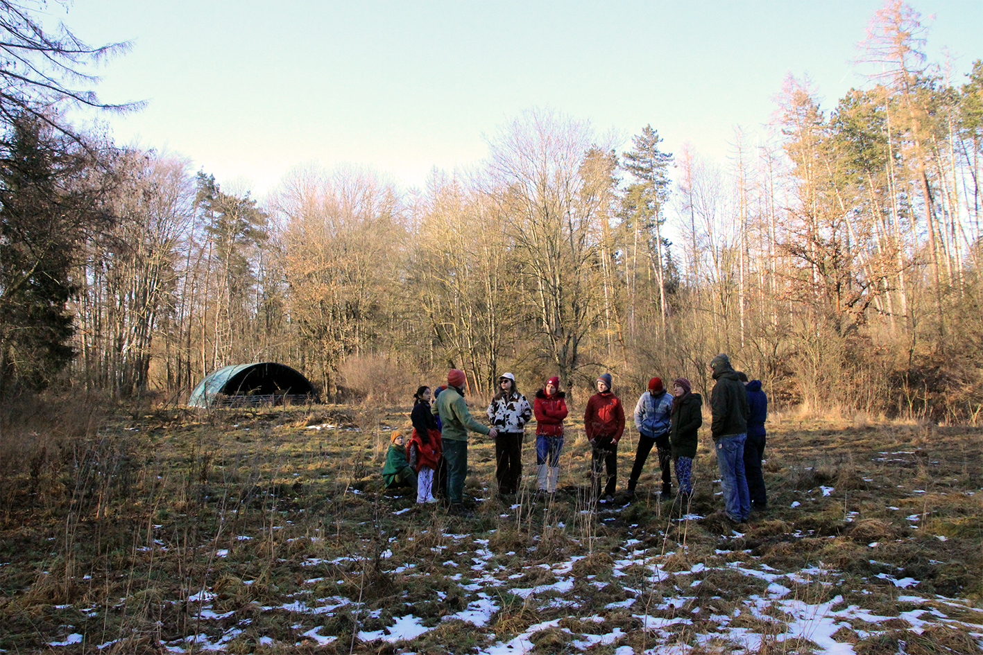 Ein zentraler Baustein des Moduls war die darauffolgende Exkursion. Diese hatte zum Ziel, die Theorie, die in diesem akademischen Modul im Vordergrund stand, mit der Praxis zu verbinden. Gemeinsam mit dem Verein kollektiv komplex e.V. verbrachte das Seminar einen Tag in Holzdorf bei Weimar. Dort gibt es eine gemeinschaftlich verwaltete, entwickelte und umgebaute Wald- und Weidefläche. Die dort existierenden Wiesenbiotope und Waldfläche erstrecken sich auf knapp 50.000 qm und schließen viele Randzonenbereiche, die sich durch besonders hohe Diversität auszeichnen, ein. Gleichzeitig sind an diesem Ort die Veränderungen durch den Klimawandel besonders gut sicht- und erfahrbar.