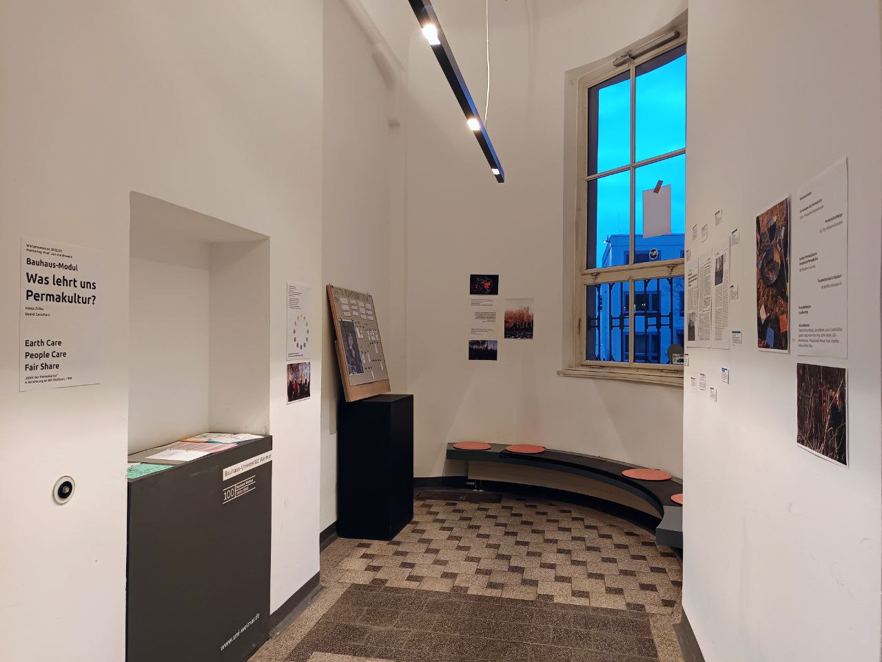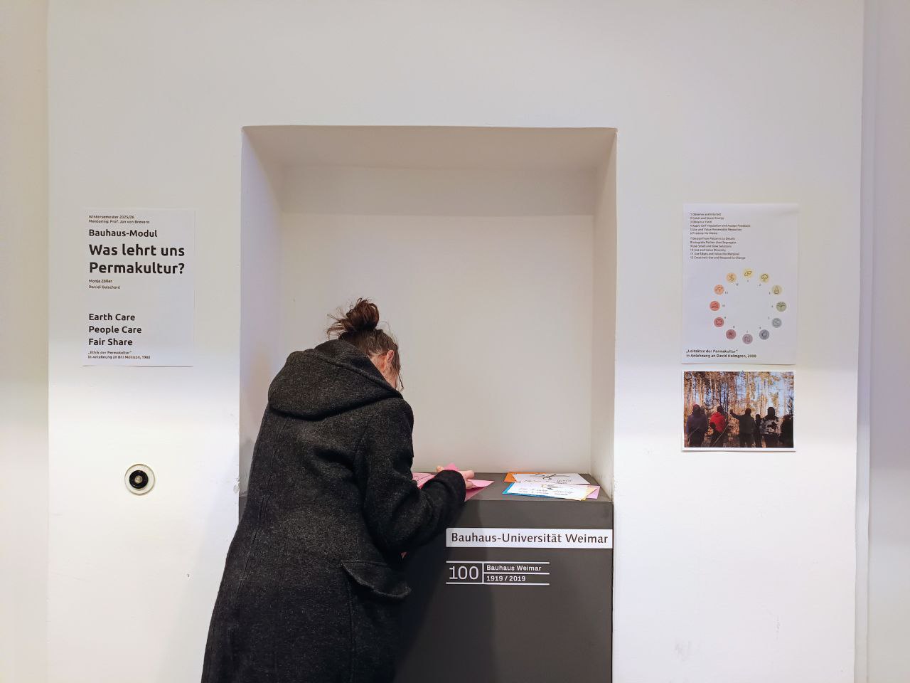 In der ersten Phase des Bauhaus.Moduls erarbeiteten die Lehrenden gemeinsam mit den Studierenden Grundlagen zum Verständnis von Permakultur, deren Theorie und Ethik anhand von Literatur und Diskussionen. Anschließend gestalteten zwei Gastdozierende jeweils zwei Unterrichtseinheiten. Während Gastdozent Filip Hillmann-Goncalves den Fokus auf Entwurfspraktiken und Permakultur-Design legte, nahm Pia-Marie Surkamp die sozialen und dekolonialen Aspekte der Permakultur in den Blick.