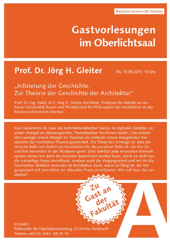 Am Mittwoch, den 18. Mai 2011 um 19 Uhr referiert Prof. Dr.-Ing. habil. M.S. Jörg H. Gleiter im Oberlichtsaal über Aspekte der Theorie in der Geschichte der modernen Architektur. Jorg H. Gleiter ist Architekt, Professor für Ästetik an der Freien Universität Bozen und Privatdozent für Philosophie der Architektur an der Bauhaus-Universität Weimar.
