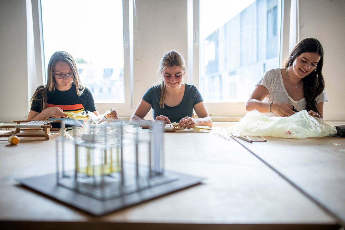 Fast 100 Erstsemester-Studierenden im Bachelor Architektur und im Masterstudiengang MediaArchitecture hatten im vorangegangenen Wintersemester das Thema zunächst einzeln bearbeitet. In einem nächsten Schritt hat rund ein Drittel davon die Ideen in kleinen Gruppen schrittweise zu sechs sehr unterschiedlichen Entwurfskonzepten zusammengeführt: Ein Entwurf spannt ein Wegenetz mit Vernetzungsfäden, ein anderer setzt auf Lichtrahmen; andere gestalten eine Pavillonarchitektur mit einem Farbraum oder Urban Gardening-Flächen, ein weiterer arbeitet die Idee einer begehbaren Klanginstallation aus.