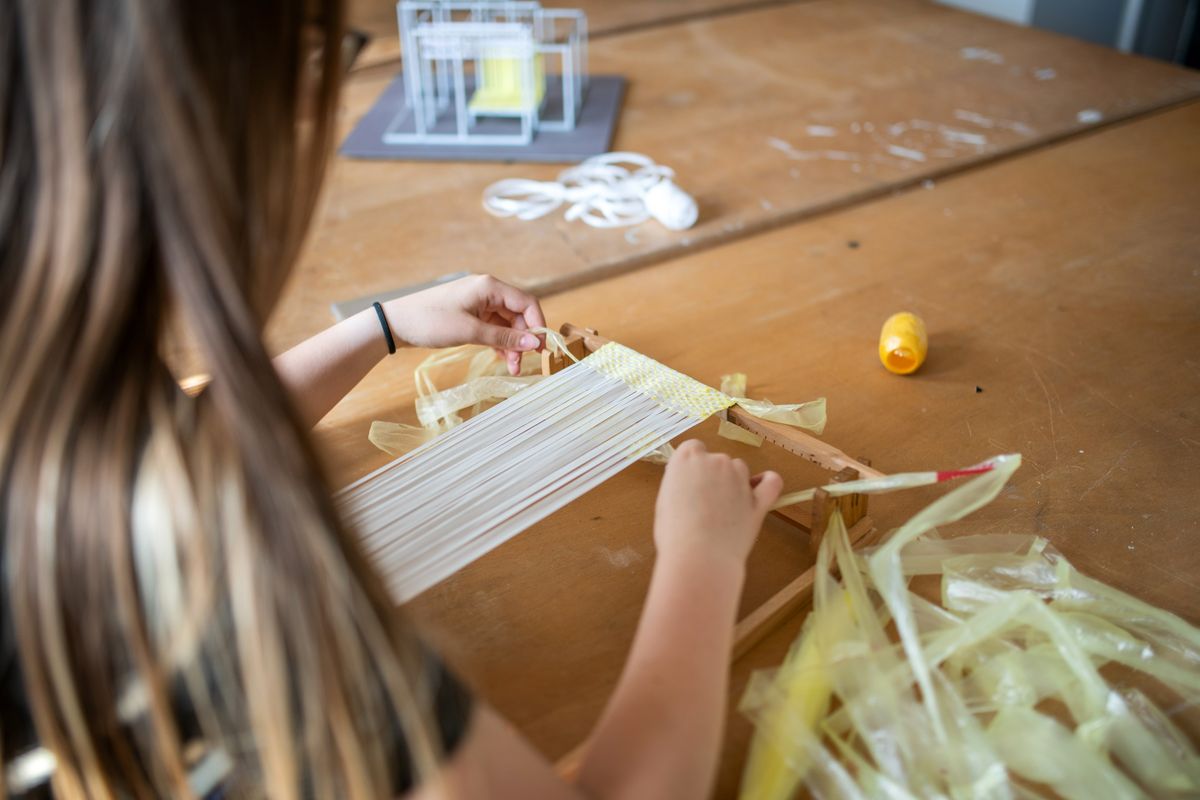 Eine sechsköpfige Gruppe hat sich unter anderem mit dem ehemaligen Direktorenzimmer im Hauptgebäude der Universität beschäftigt. Der studentische Entwurf ermöglicht es, in Gropius‘ Philosophie vom Raum sprichwörtlich einzusteigen. In dem 1923 von Gropius gestalteten, in den 1990er Jahren rekonstruierten Gropiuszimmer verbindet sich die künstlerische Zusammenarbeit verschiedener Werkstätten mit den fortschrittlichen Gestaltungsansätzen des Bauhaus. »Uns haben die Raumästhetik mit ihrer geometrischen Struktur und die vom Handwerk als Ideal gekennzeichnete Raumidee fasziniert. Unser Modell basiert auf ineinander verschränkten Quadern aus Aluminiumprofilen, an die Textilbänder als Informationsträger gespannt sind«, so Diana Buterus, eine der am Projekt beteiligten Studierenden. Bei der Umsetzung ist das Team auch auf Ideen der anderen Gruppen eingegangen: So basiert beispielsweise das Konstrukt des Mobiliars auf den Modulen der Lichtkuben-Gruppe oder greifen charakteristische Elemente des Einrichtungsdesigns durch das Auf- und Abtauchen oder Umknicken den Vernetzungsfaden auf. »Die positive Rückmeldung unserer Betreuer hat uns ermutigt, den Raum zur summaery auch tatsächlich zu bauen. Allerdings mussten wir das Modell für den Bau vereinfachen und umplanen, weil Zeit und Geld fehlten. Ein umfangreiches Sachsposoring von Holz und Folienstreifen ermöglicht uns eine kurzfristige Realisierung«, ergänzt die angehende Architektin.