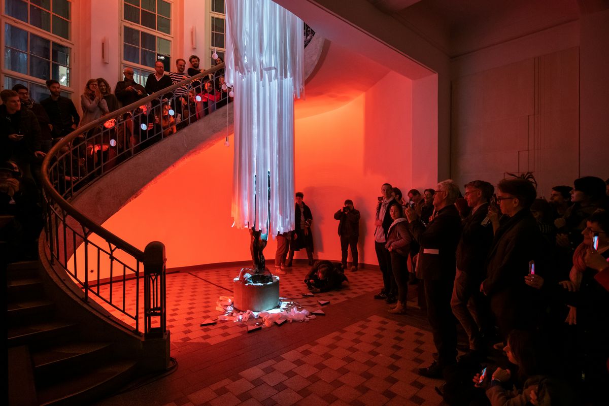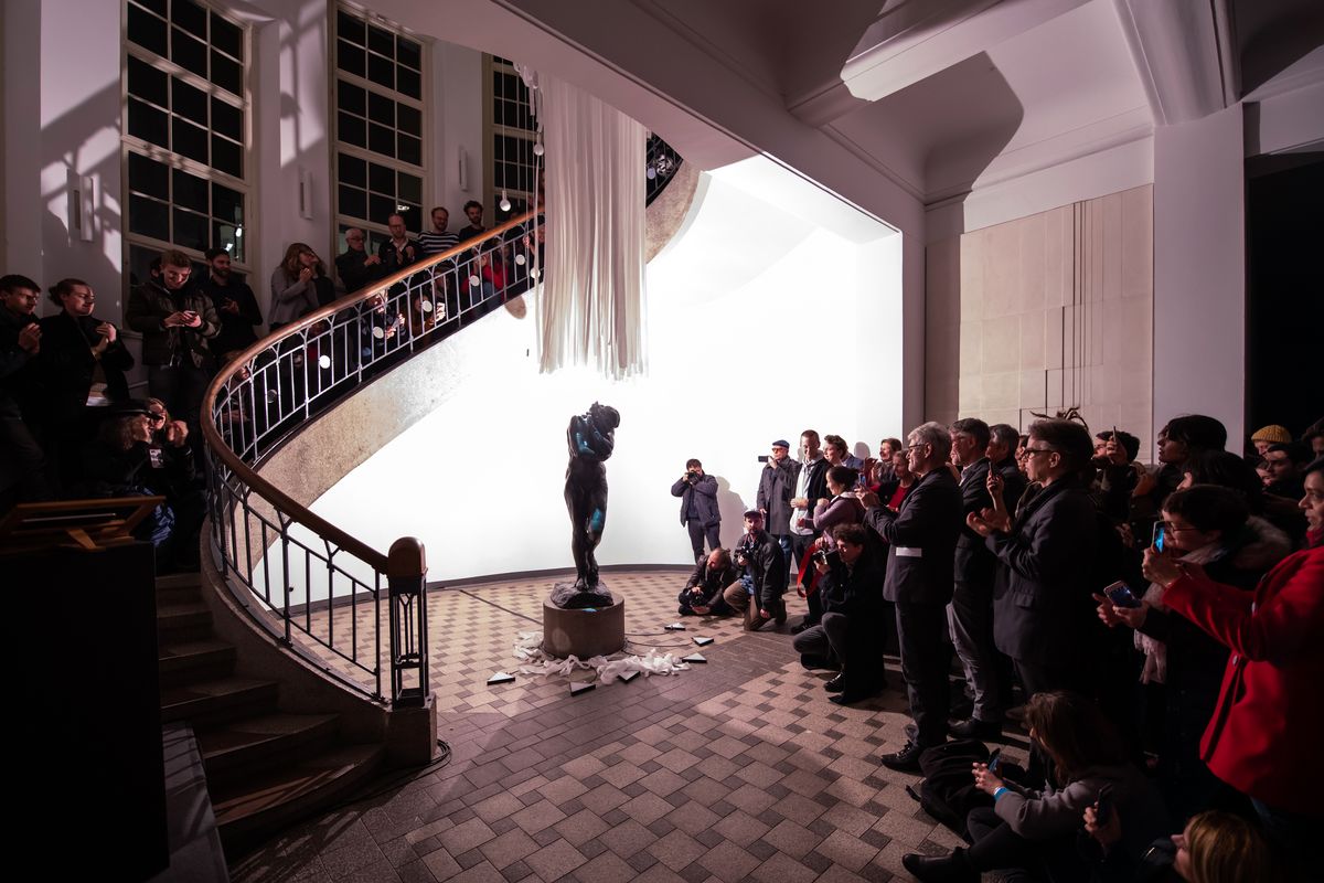 Nach ihrer mutwilligen Beschädigung im Februar 2016 und ihrer erfolgreichen Restaurierung in der Werkstatt von Ilja Streit wurde die »Eva« im Rahmen einer feierlichen Zeremonie an dem ihr angestammten Platz im Hauptgebäude der Bauhaus-Universität Weimar empfangen. Der Einladung zur Veranstaltung waren zahlreiche Besucherinnen und Besucher aus der universitären und der Weimarer Öffentlichkeit gefolgt. Die Enthüllung der »Eva« wurde unter Begleitung von Musik und Licht im Hauptgebäude feierlich inszeniert. »Das ist ein besonderer Moment für unsere Universität.«, eröffnete Prof. Dr. Winfried Speitkamp, Präsident der Bauhaus-Universität Weimar, in seinem Grußwort. »Der Akt der Gewalt und der betonten Missachtung, der ihr im Jahre 2016 widerfahren musste, hat große Solidarität und Unterstützung hervorgerufen. Mein großer Dank gilt daher allen, die sich bei der Restaurierung engagiert haben, an erster Stelle natürlich denjenigen, die durch ihre Spende die Restaurierung möglich gemacht haben. Besonderer Dank gilt dem Ehepaar Thomas und Birgit Rabe, die durch eine beträchtliche Spende den Großteil zur Finanzierung der Restaurierung beigetragen haben«, so Speitkamp.