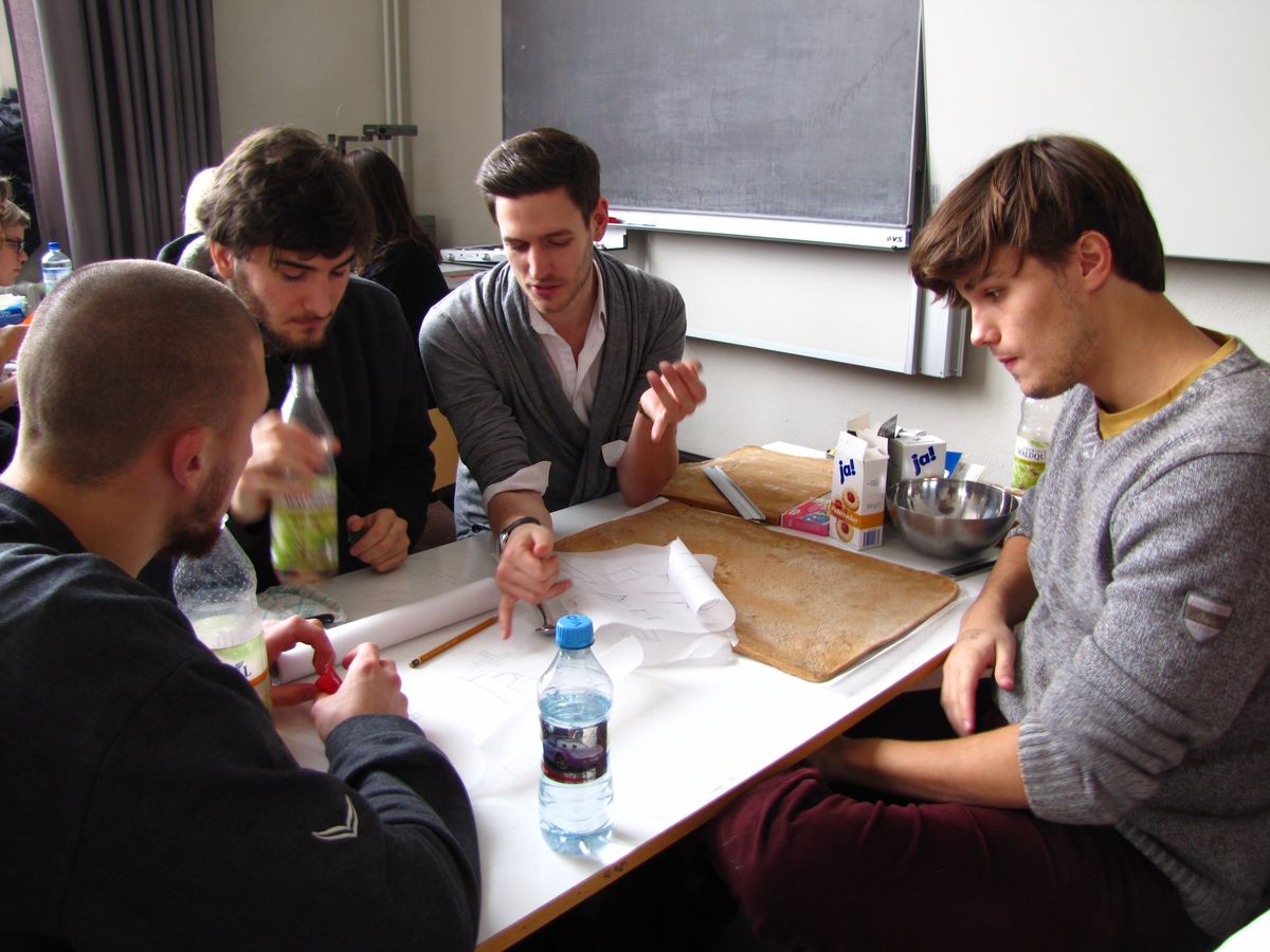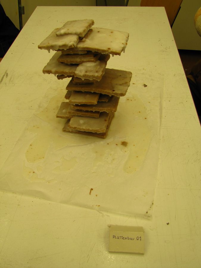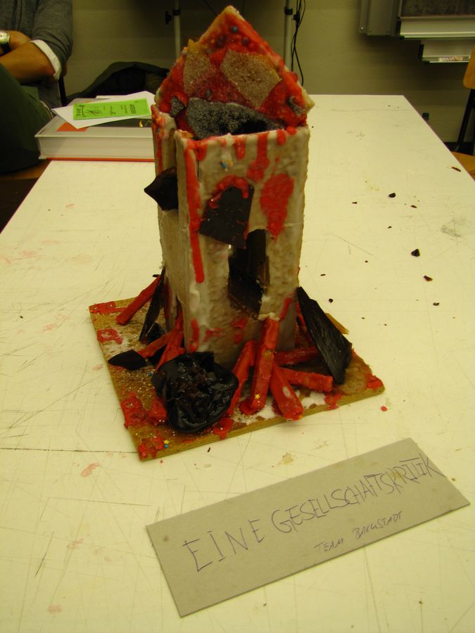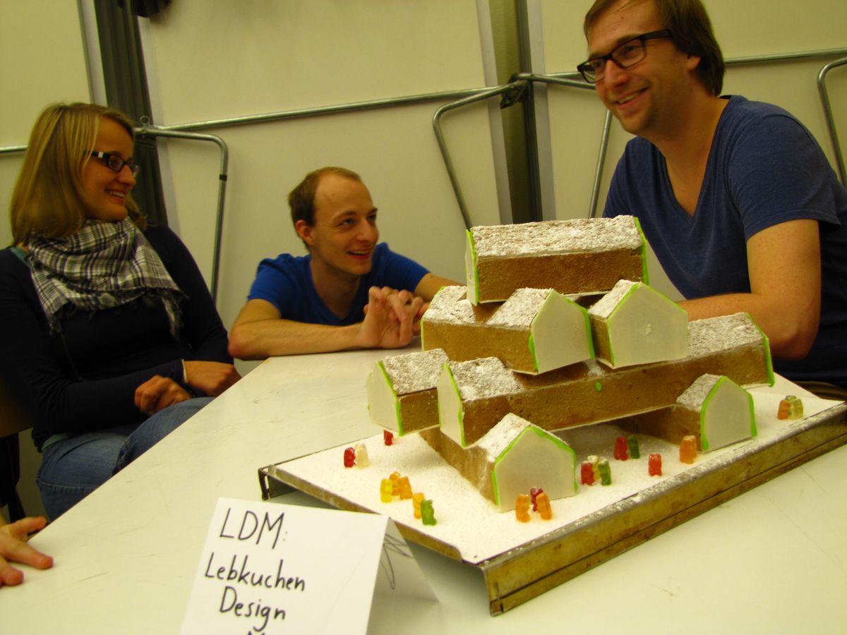 Fünf Stunden lang wurde konstruiert, gebaut, gebastelt, geklebt und schließlich alles in liebevoller Feinarbeit und vor allem bunt dekoriert. Genauso unterschiedlich wie die Teams waren auch die zwölf farbenfrohen Gebilde, die entstanden sind. Die Breite reichte von einem »Plattenbau«, der nur aus Lebkuchenplatten und Zuckerguss bestand und mit seiner skulpturalen Struktur und Reinheit überzeugen wollte, über ein Gruselhaus und ein Hexenhäuschen. Jedoch haben viele Teams auch versucht, eine Botschaft durch ihr Kunstwerk zu vermitteln. Die Urbanistik-Studierenden des Teams »Urbtopia« wollten die Traumvorstellung ihres Studiengangs, dass irgendwann keine Autos mehr existieren, umsetzen. Deshalb bauten sie ein Denkmal für Autos. Die »Liebkuchen« erschufen einen »Tempel der Lebkuchengöttin«, weil sie Liebe verbreiten wollten und Liebe auch durch den Magen geht.