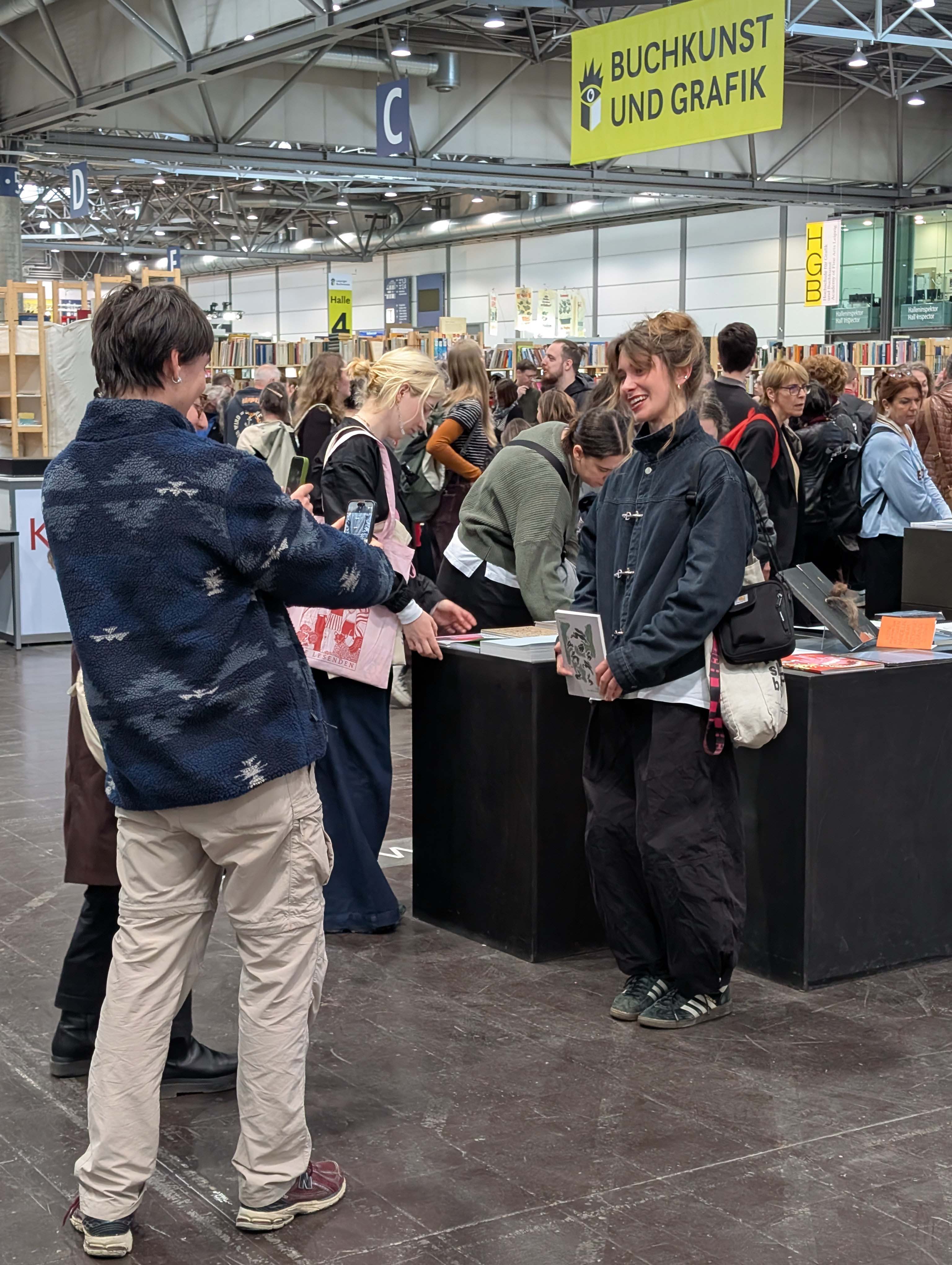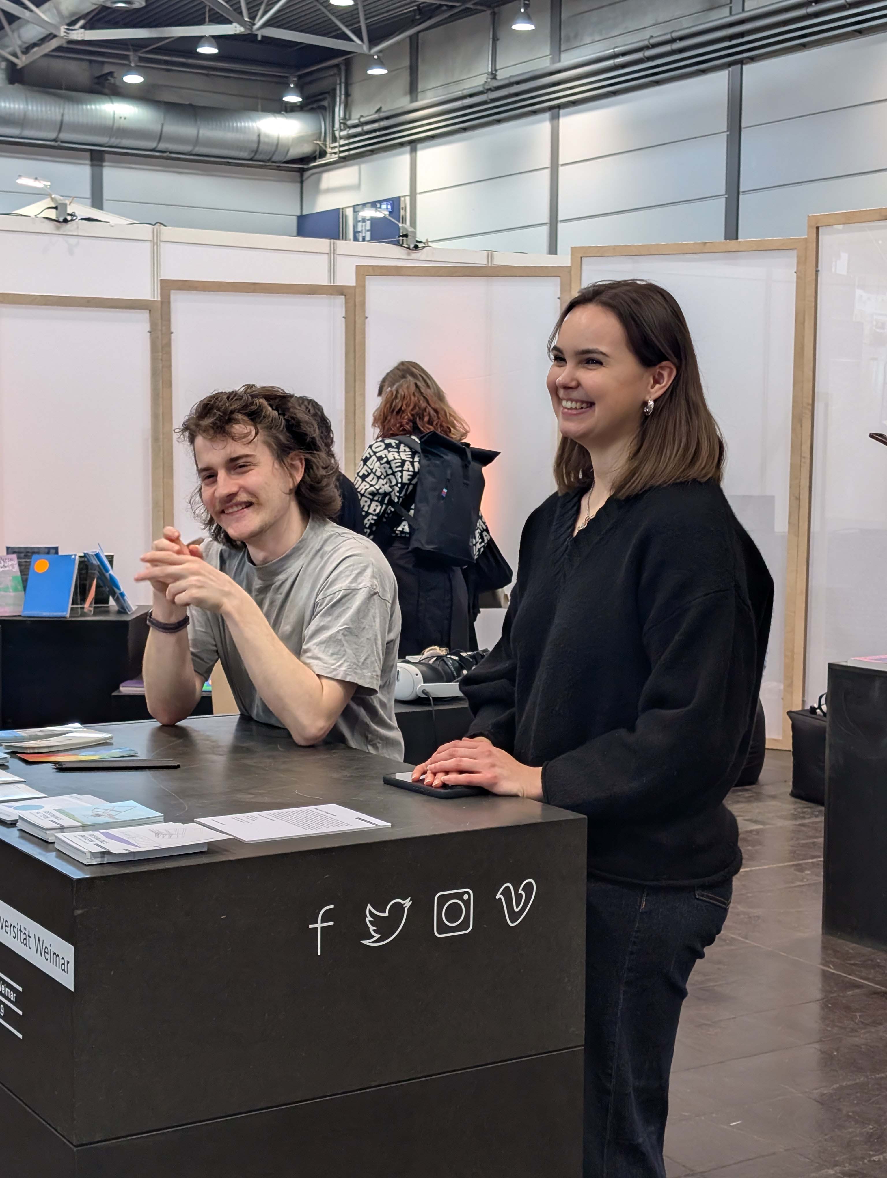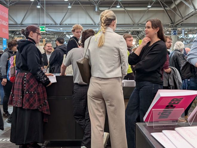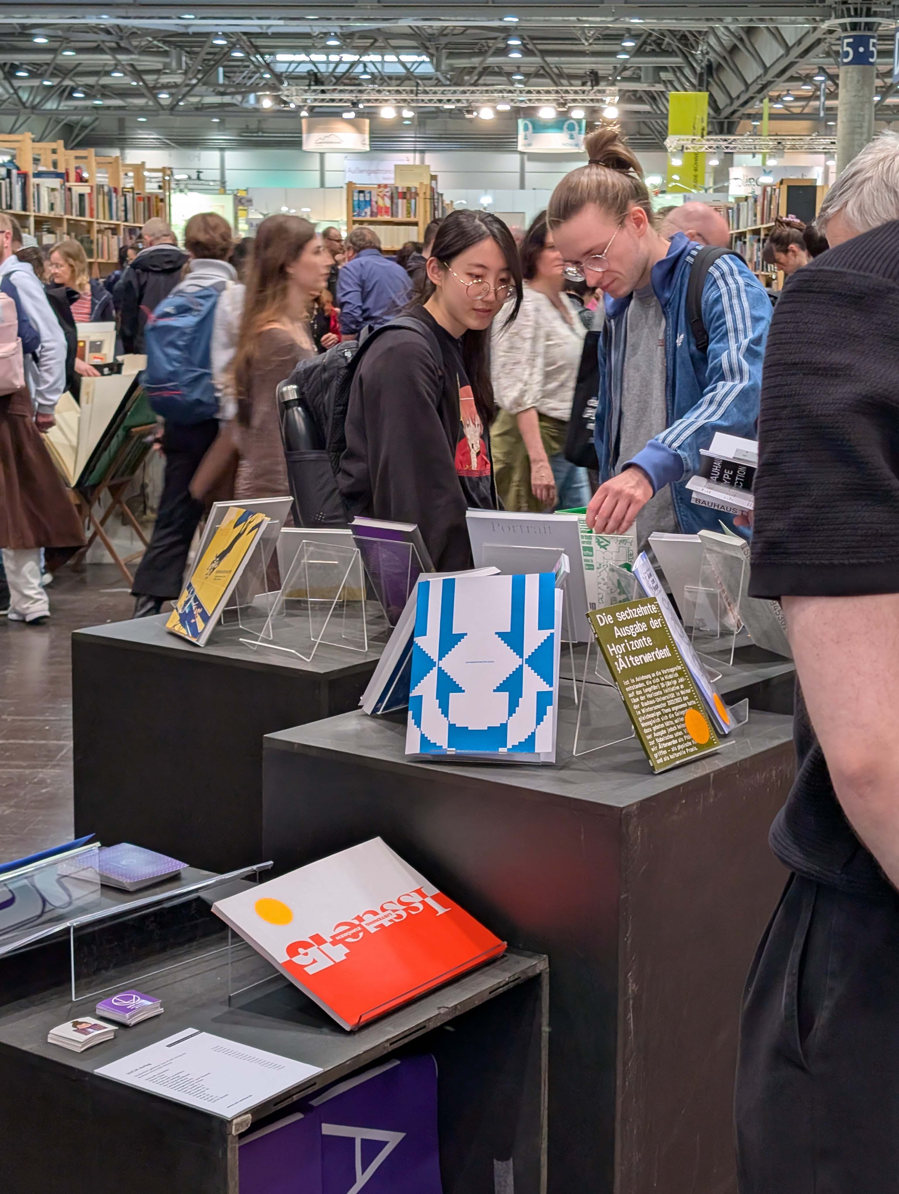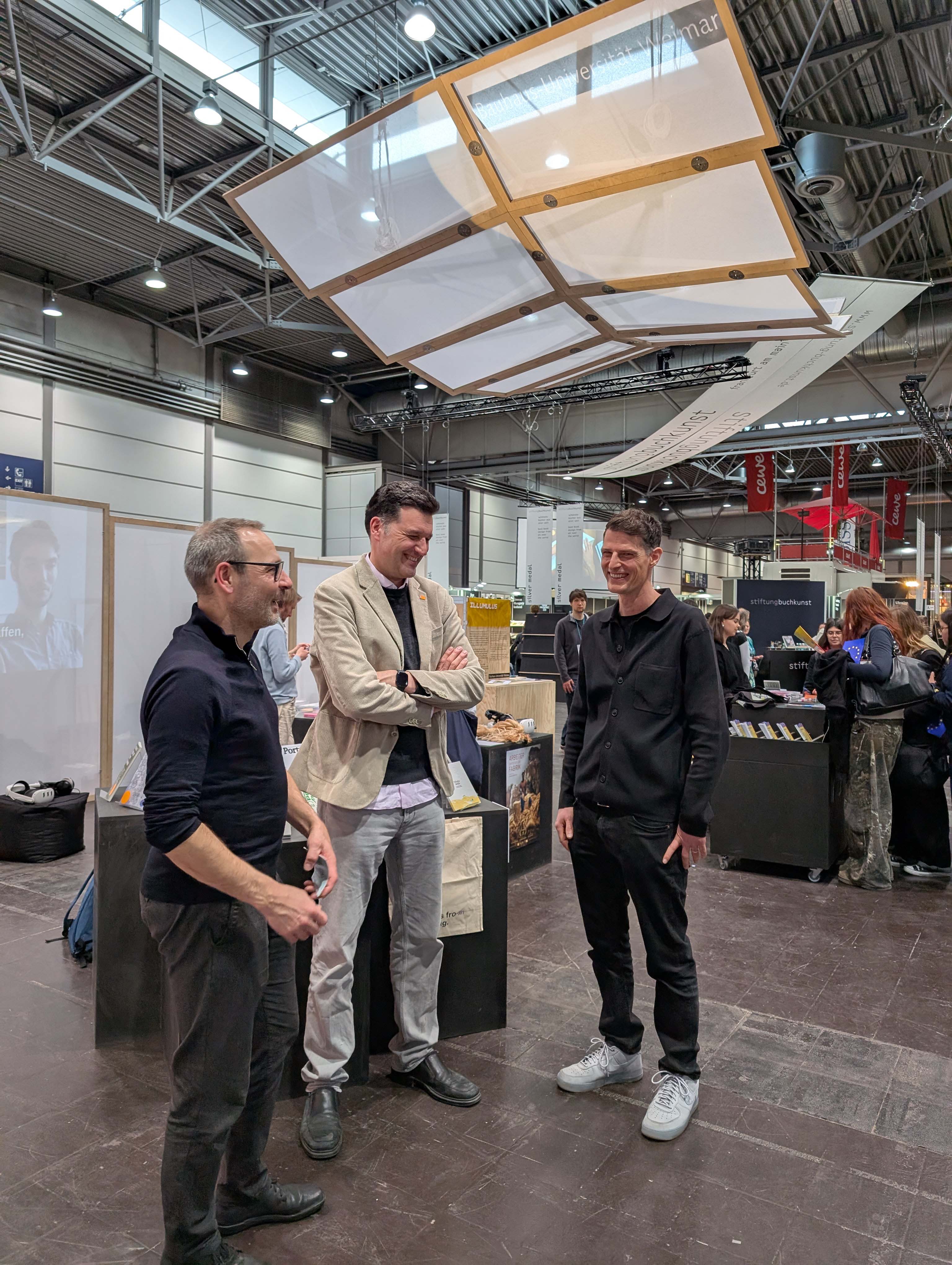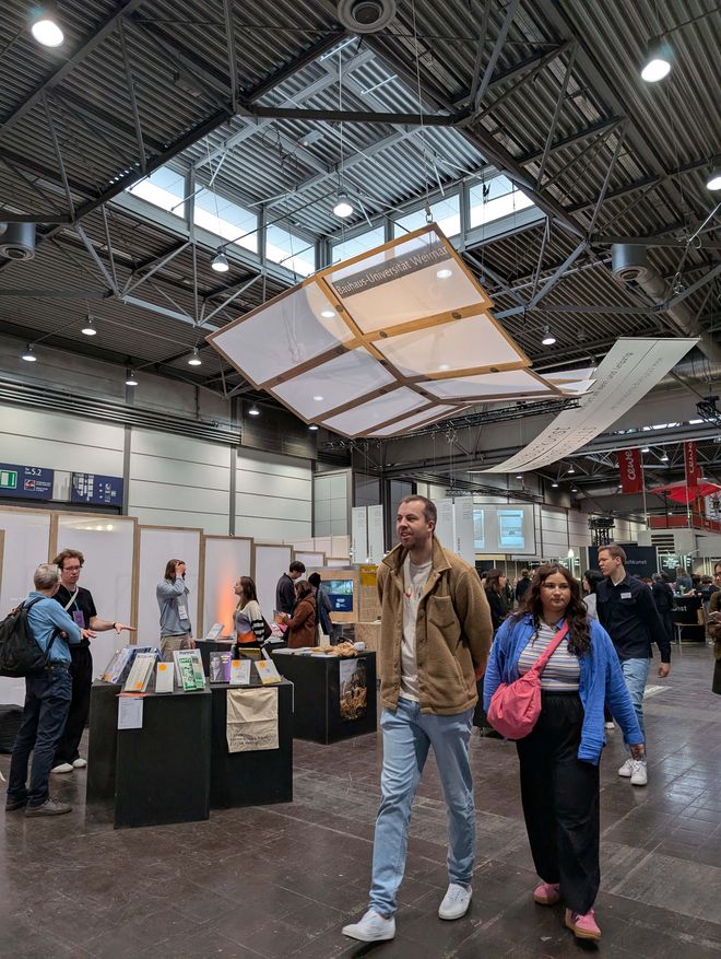 Die schwebende Dachkonstruktion bildete den Rahmen für die diesjährige Ausstellungsfläche der Universität, welche sich in bester Gesellschaft direkt neben den »schönsten Büchern der Welt« befand und über die gesamte Messezeit immer wieder interessiertes Publikum anlockte. Der Andrang war insgesamt riesig, die Messe vermeldete für 2026 einen Besucherrekord von rund 300.000 Menschen. Das Publikum? Eine Mischung aus Studieninteressierten, Buchliebhabern, Kunst-Affinen bis hin zu Alumni der Bauhaus-Universität Weimar.