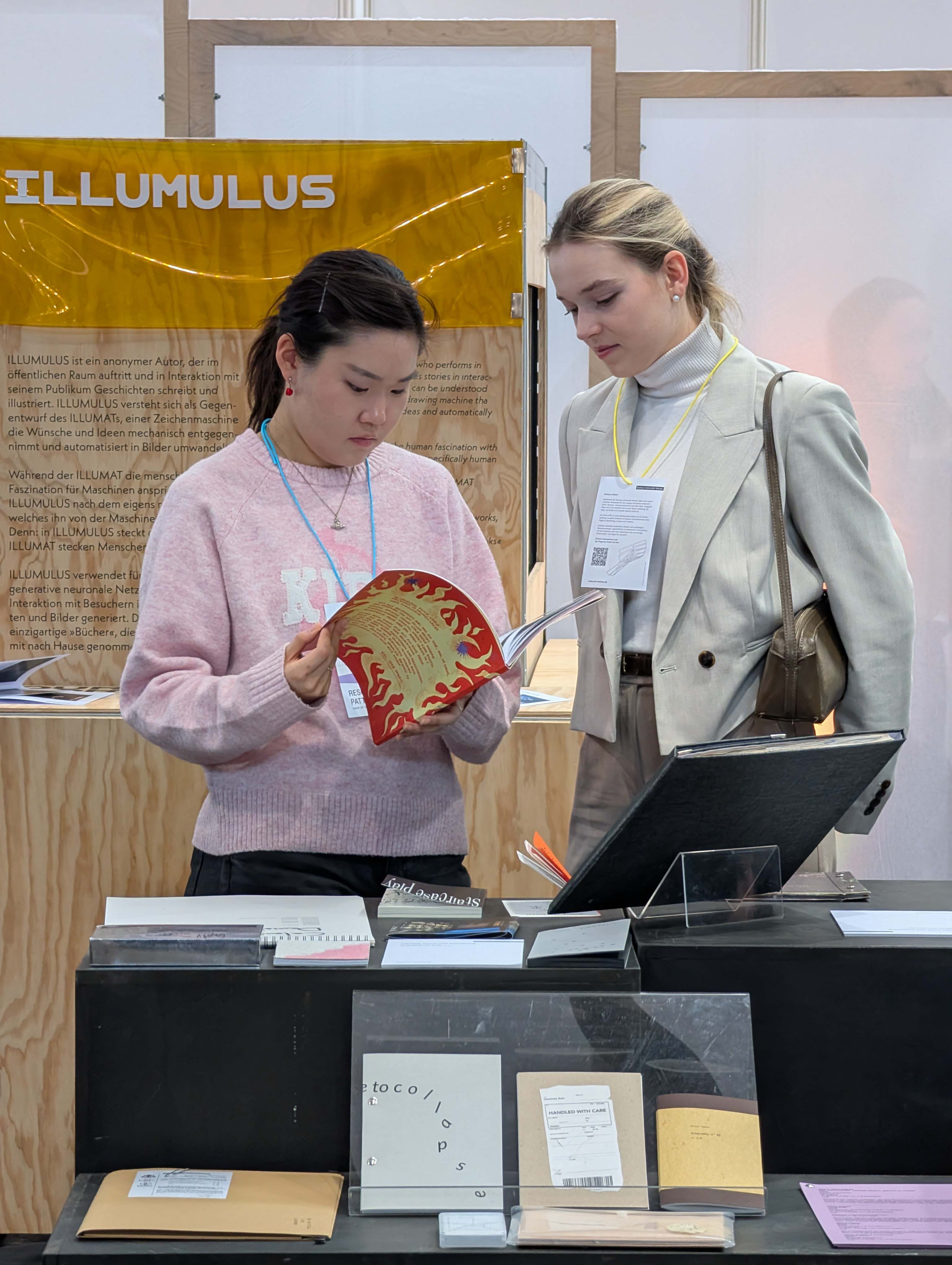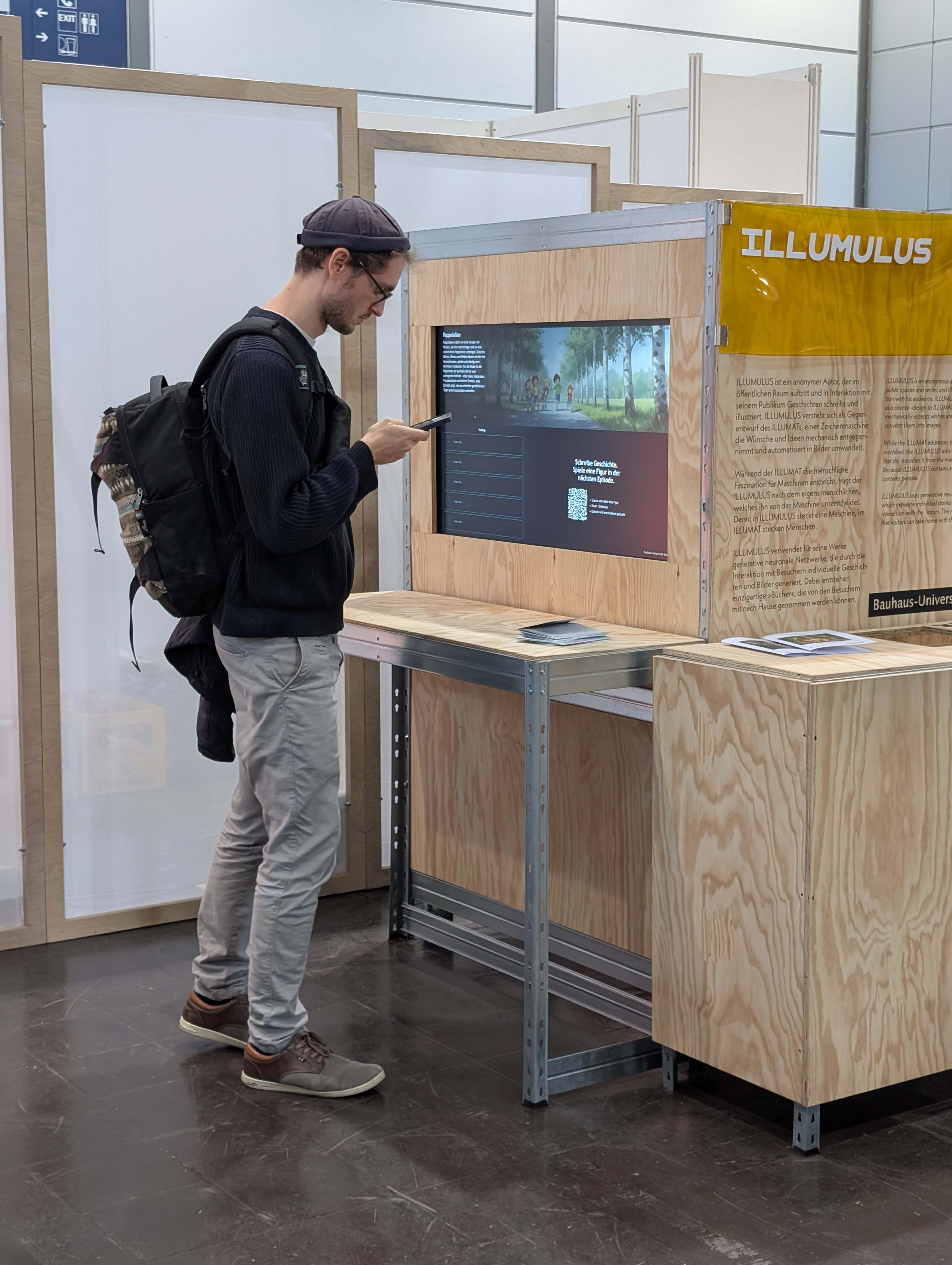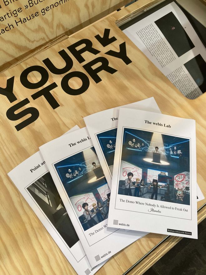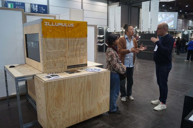 Vier Tage lang konnten die Messebesucher*innen am Stand der Universität künstlerische sowie wissenschaftliche Publikationen aller Fakultäten sowie des studentisch geführten Non-Profit-Verlages LUCIA anschauen und teilweise erwerben. Ergänzend gab es Mitmach-Angebote wie den »Illumnus«, eine interaktive Installation aus dem Fachbereich Medieninformatik, welcher die Gäste über ihr Smartphone in verschiedene Rollen schlüpfen ließ und mithilfe einer KI zum gemeinsamen Storytelling anregte.