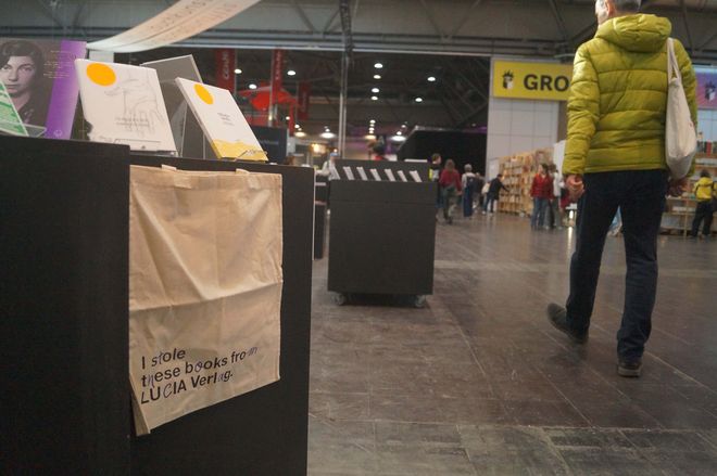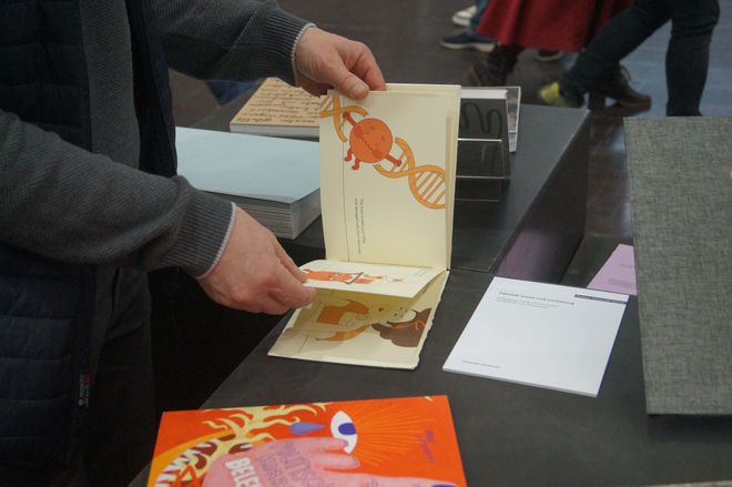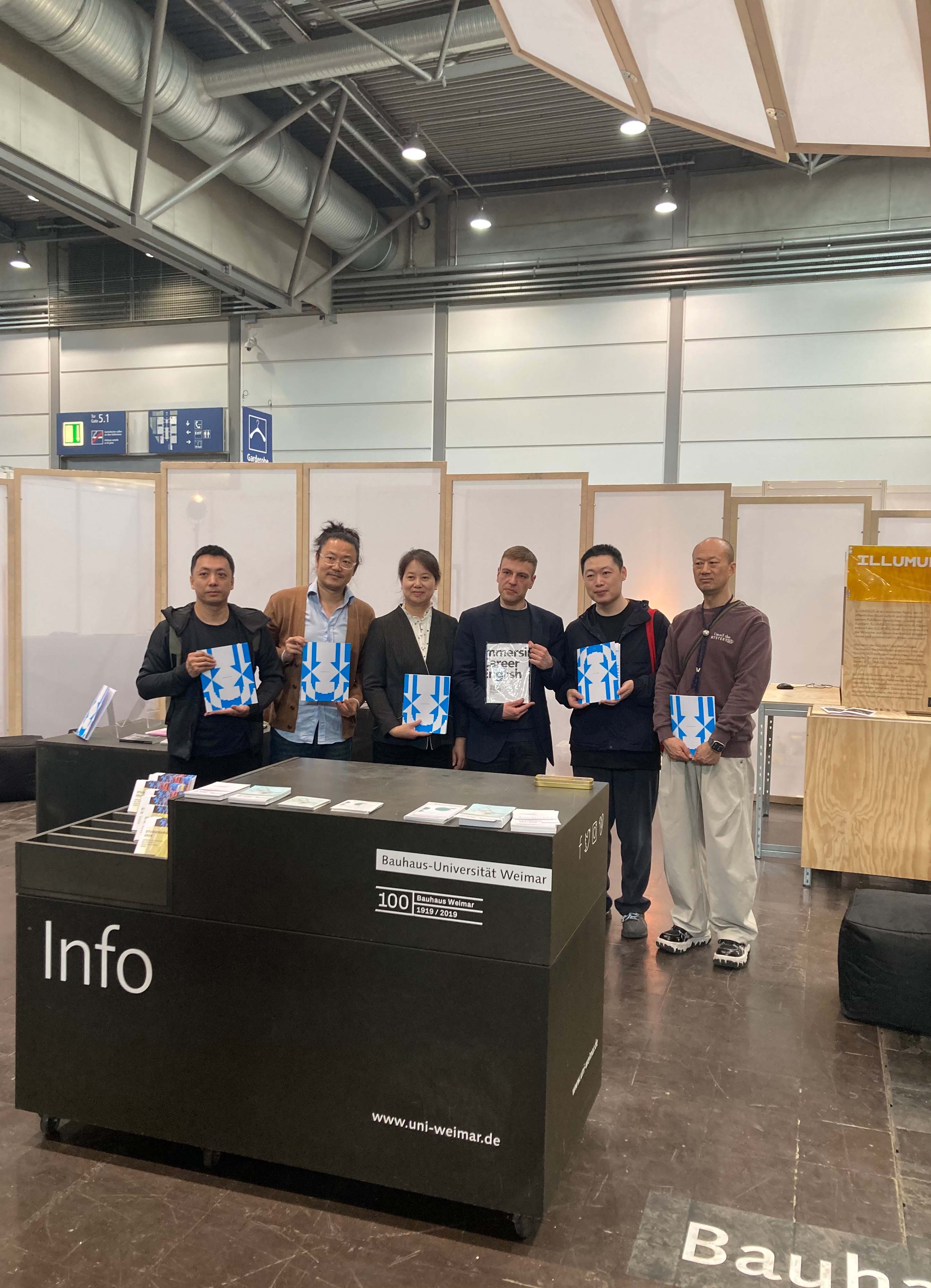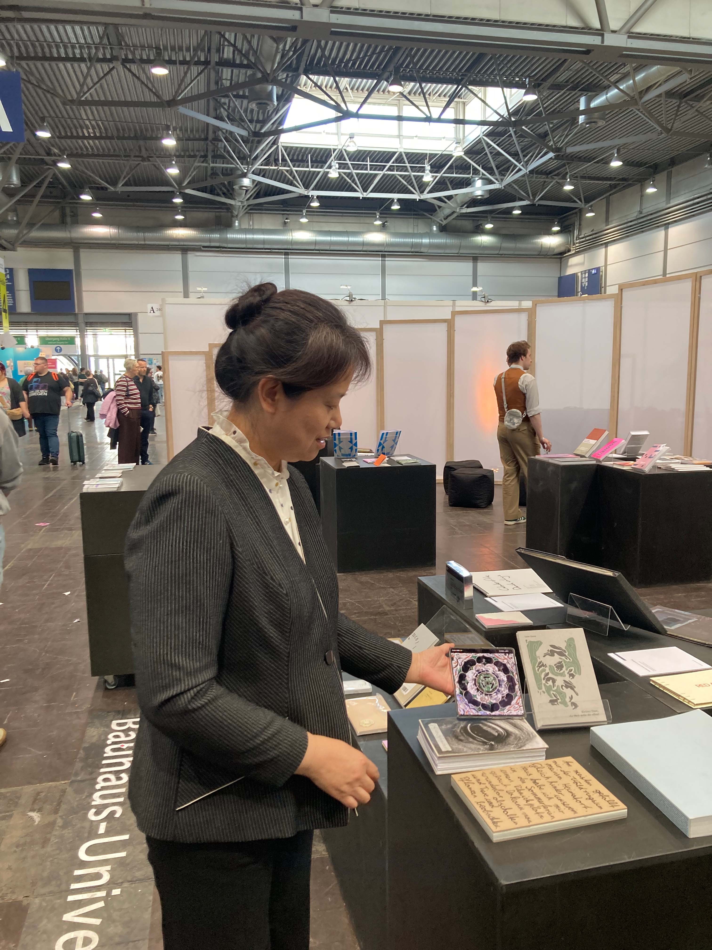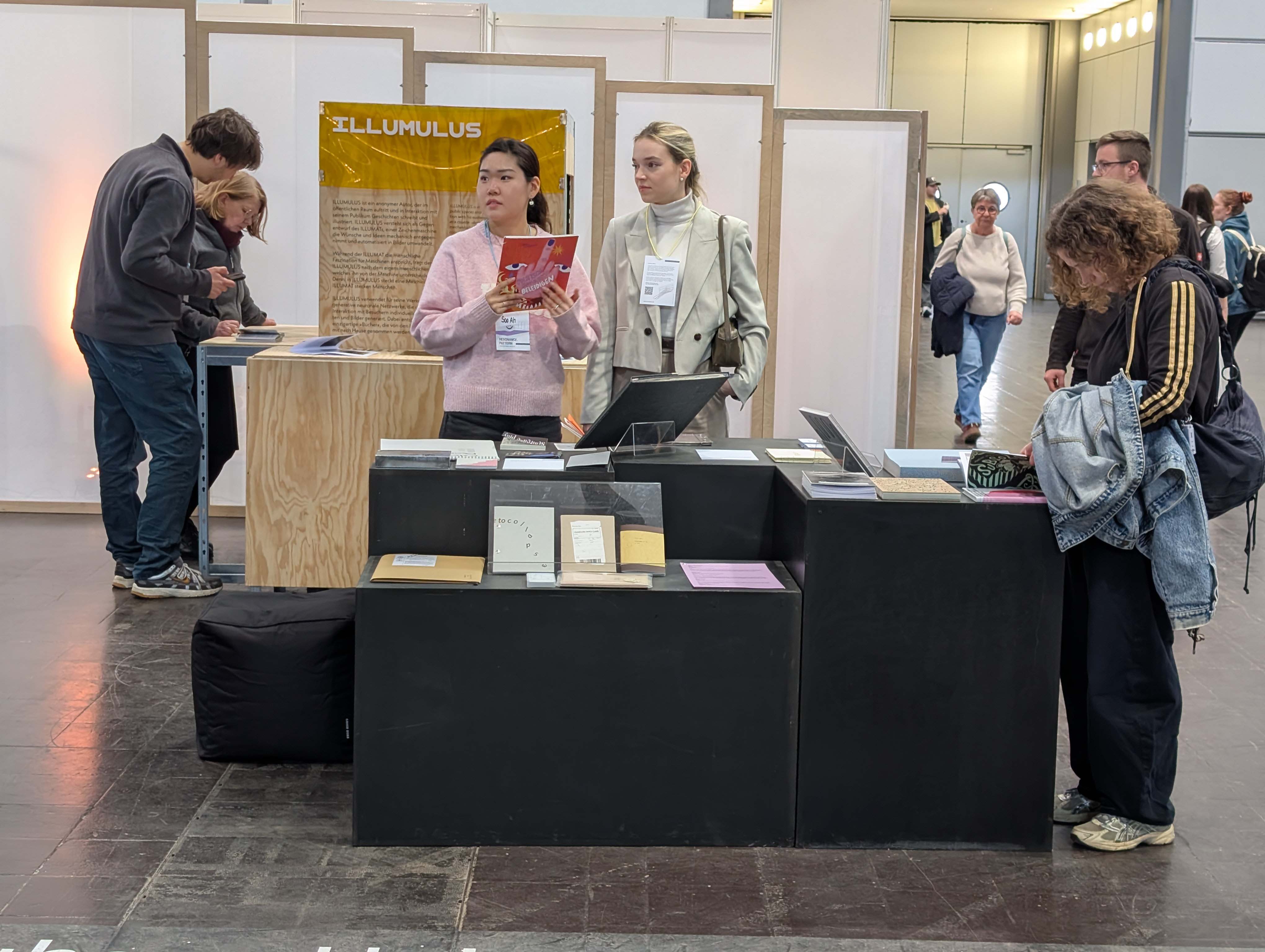 Vier Tage lang konnten die Messebesucher*innen am Stand der Universität künstlerische sowie wissenschaftliche Publikationen aller Fakultäten sowie des studentisch geführten Non-Profit-Verlages LUCIA anschauen und teilweise erwerben. Ergänzend gab es Mitmach-Angebote wie den »Illumnus«, eine interaktive Installation aus dem Fachbereich Medieninformatik, welcher die Gäste über ihr Smartphone in verschiedene Rollen schlüpfen ließ und mithilfe einer KI zum gemeinsamen Storytelling anregte.