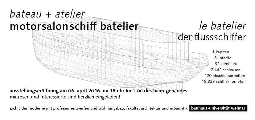 Vom 6. April bis 6. Mai 2016 stellt eine Ausstellung im Hauptgebäude der Bauhaus-Universität Weimar das besondere Lehrformat der Reisen vor, die Prof. Walter Stamm-Teske gemeinsam mit Studierenden auf dem MotorSalonSchiff (MSS) Batelier unternommen hat. Das Schiff war auf den Exkursionen stets Wohn- und Lernort, Hotel, Atelier und Salon zugleich.