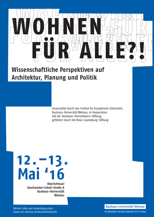 Die Wohnungsmärkte in Deutschland sind seit der globalen Finanzkrise von 2008 insbesondere in prosperierenden Metropolregionen, Großstädten und Universitätsstädten angespannt. Steigende Mieten und Wohnungspreise erschweren es einkommensschwachen Haushalten und teils auch der Mittelschicht zunehmend, bezahlbaren Wohnraum in der Stadt zu finden. Die Konferenz »Wohnen für alle?! Wissenschaftliche Perspektiven auf Architektur, Planung und Politik« an der Bauhaus-Universität Weimar sucht am 12. und 13. Mai 2016 nach Gründen für die Rückkehr der Wohnungsfrage und nach möglichen Strategien für bezahlbaren Wohnraum für alle.