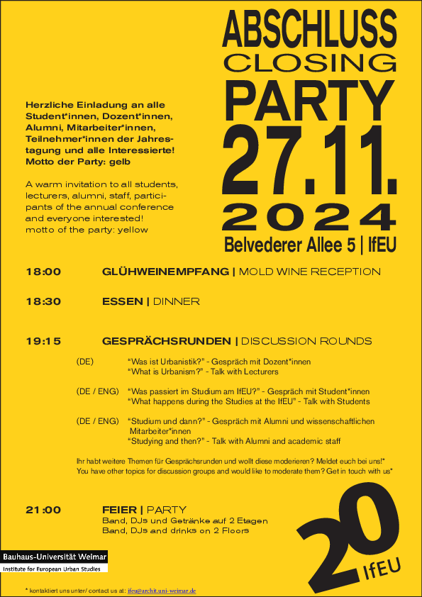 An den beiden Folgetagen (Donnerstag 28.11.- Freitag 29.11.) wird die IfEU-Jahrestagung „Zivilgesellschaftliches Engagement und Stadterneuerung“ stattfinden. Anmeldung zur Tagung ist ab Anfang Oktober hier möglich.