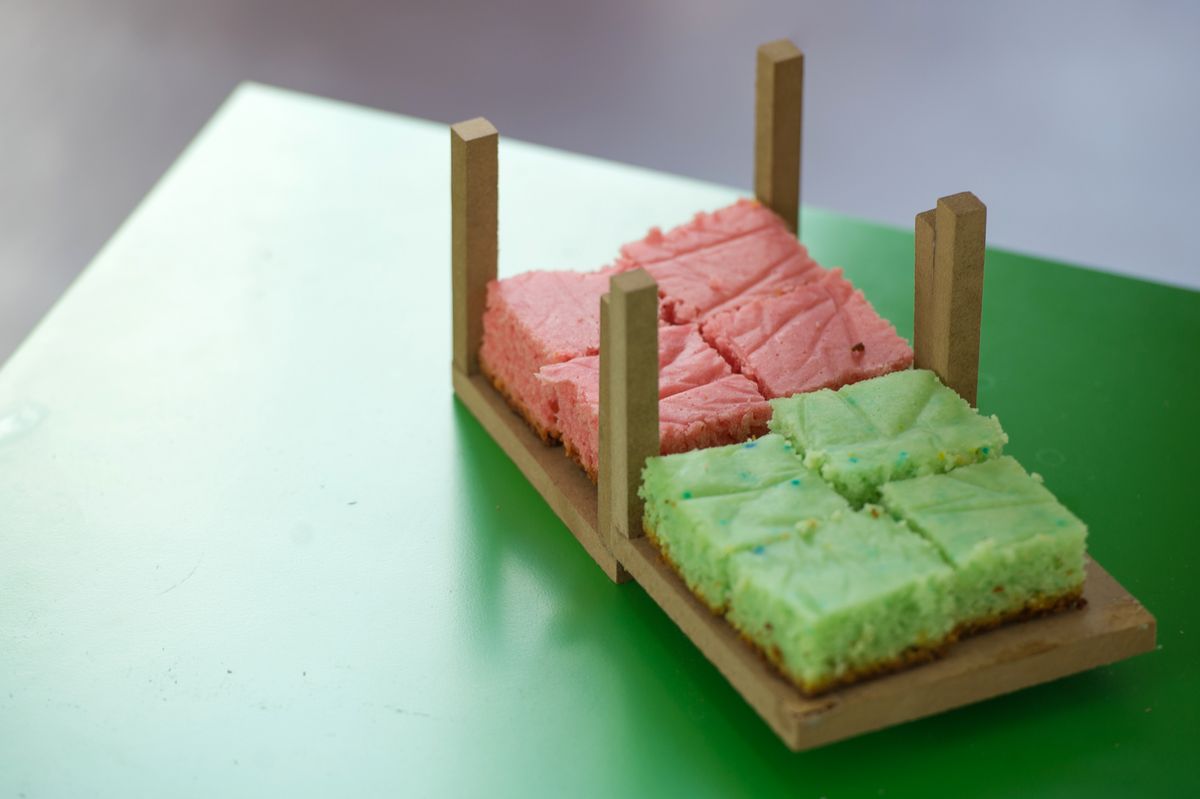 Vor den Kuben greift eine Sirup-Bar die Idee des Stäbetanzes von Oskar Schlemmer in einer Konstruktion aus Dachlatten auf. 1.300 laufende Meter Dachlatten werden dafür analog der mathematischen Fibonacci-Reihe aufgestellt. »Die größte logistische Herausforderung für uns liegt darin, innerhalb kürzester Zeit die 247 Knoten zu bewerkstelligen. Ich habe mir viele Tutorials im Internet angeschaut und geübt, geübt, geübt«, so die Studentin Laura Adler.