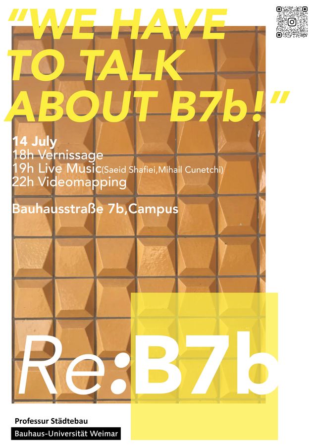 Im Seminar »Utopsie B7b« haben sich Studierende im Master Architektur im Sommersemester 2022 an der Professur Städtebau mit dem alten Institutsgebäude in der Bauhausstraße 7b auf dem Südcampus der Bauhaus-Universität Weimar beschäftigt. Als Abschluss des Seminars findet ein interaktives Event an und in der B7b statt, in dem die Ergebnisse und Visionen präsentiert und Gebäude mit kleinen, aber wirksamen Eingriffen aktiviert wird.