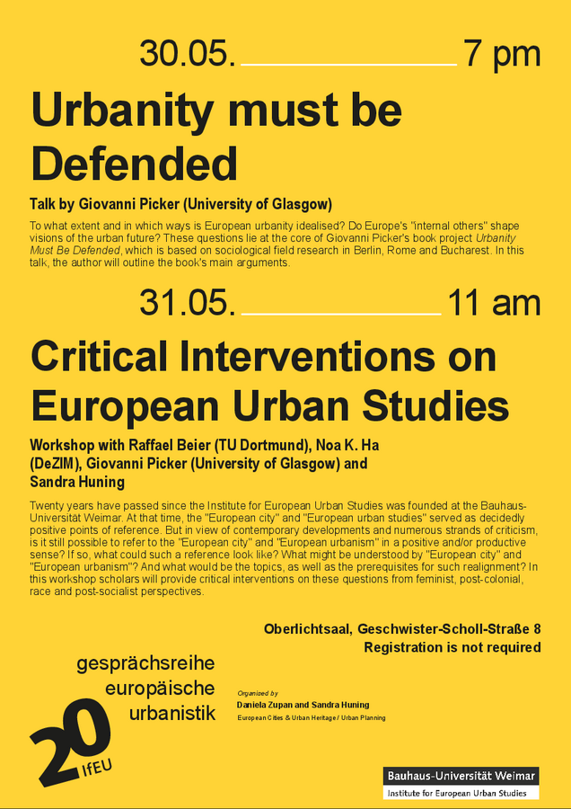 Twenty years have passed since the Institute for European Urban Studies was founded at the Bauhaus-Universität Weimar. At that time, the "European city" and "European urban studies" served as decidedly positive points of reference. But in view of contemporary developments and numerous strands of criticism, is it still possible to refer to the "European city" and "European urbanism" in a positive and/or productive sense? If so, what could such a reference look like? What might be understood by "European city" and "European urbanism"? And what would be the topics, as well as the prerequisites for such realignment? In this workshop scholars will provide critical interventions on these questions from feminist, post-colonial, race and post-socialist perspectives.