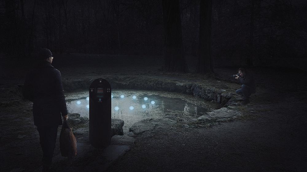 The installation is made of a circle of floating lights. The lights are pulled towards the spring output via a motor and pushed away with the current. The location of the balls depends on the mode and real time data collected on site. The light provided by the balls should spike the curiosity of passersby and attract them. For those who are more interested in the subject matter additional information will be provided via a QR code.