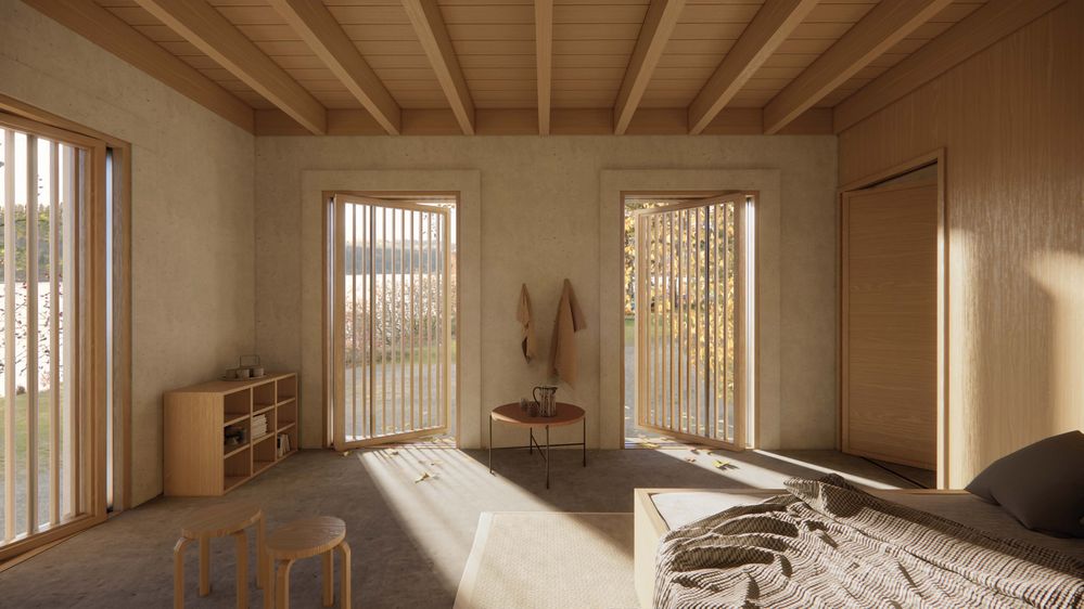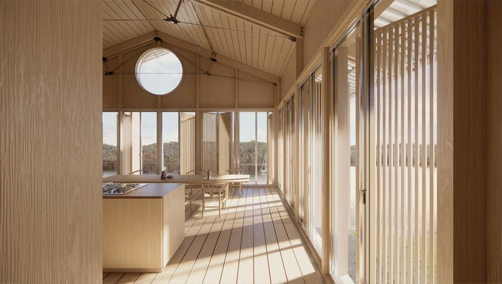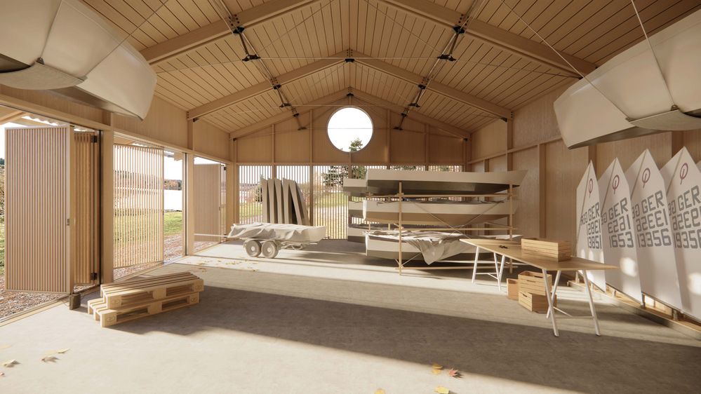 Die direkte Ankunft am Gelände der Segelschule an der Bleilochtalsperre beschreibt ebenso die Schnittstelle zwischen zwei Gebäudevolumen, die diesen Entwurf definieren. Das doppelgeschossige Vereinsheim mit darunter liegender Herberge platziert sich an direkter Achse zum Wasser hin. Die Bootshalle steht als eingeschossiger Riegel der Wasserkante parallel gegenüber. Während Wettkampfphasen zur wärmeren Jahreszeit bilden die Umkleiden der Bootshalle, der Mehrzweckraum und die Lagerhalle mit Werkstatt Platz für intensiven Regattabetrieb. Die Grundkonstruktion besteht aus modularen Holzrahmenträgern die sich additiv fügen lassen. Als doppelt unterspannte Polonceau-Träger aus Metallverbindungen unterstützen sie die Tragkonstruktion durch Zugseilverbindungen und Aussteifungselemente. Lokales Fichten- und Lärchenholz für Konstruktionshölzer und Fassadenvertäfelungen, sowie Flussgneis als Sockelmaterial stammen aus dem Thüringer Wald. Der gerahmte Blick auf den See steht vor allem im Kontext des Vereinsaals und der Gemeinschaftsräume stark im Vordergrund. Große, vertikale Fensteröffnungen ermöglichen eine visuelle Transparenz nach Außen und schaffen ein Gefühl von Offenheit und Kontinuität zwischen Innenraum und umgebender Natur. Zahlreiche Gruppen von Nutzer*innen können hier die Segelschule Turbine Bleiloch als einen Ort erleben, die Ihnen als Ort der Zusammenkunft von Schulklassen, Seminargruppen, Sportteams und Segelbegeisterten in Erinnerung bleiben wird.