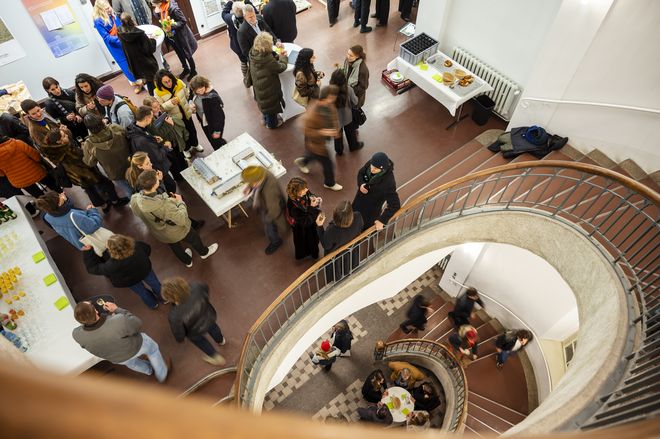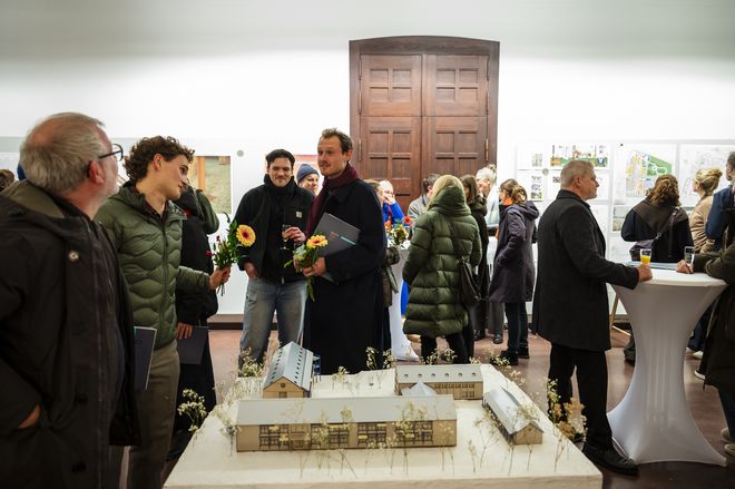 Anschließend an den Festakt kamen die Gäste im Hauptgebäude noch zum Austausch bei einem Glas Sekt und bei der Ausstellungsbesichtigung zusammen.