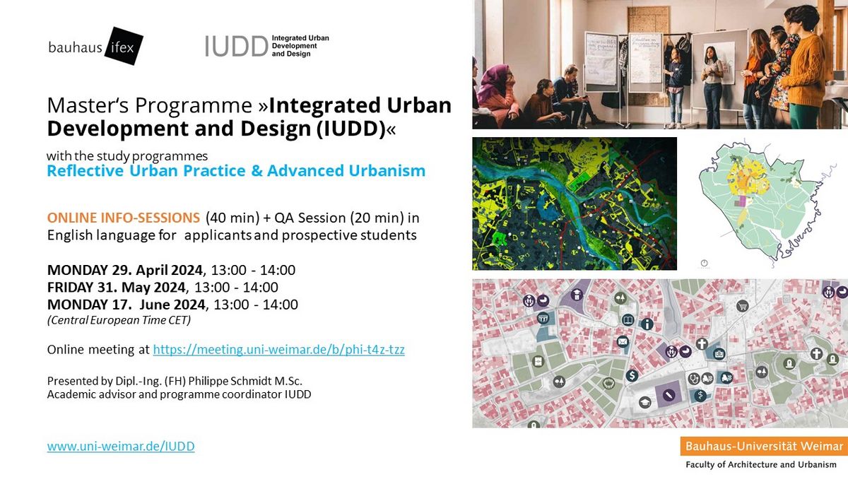 Studiengangsinteressierte und Bewerber*innen für den Studiengang Integrated Urban Development and Design sind herzlich eingeladen zur digitalen Info-Veranstaltung mit Dipl.-Ing. Philippe Schmidt, Fachstudienberater für IUDD.