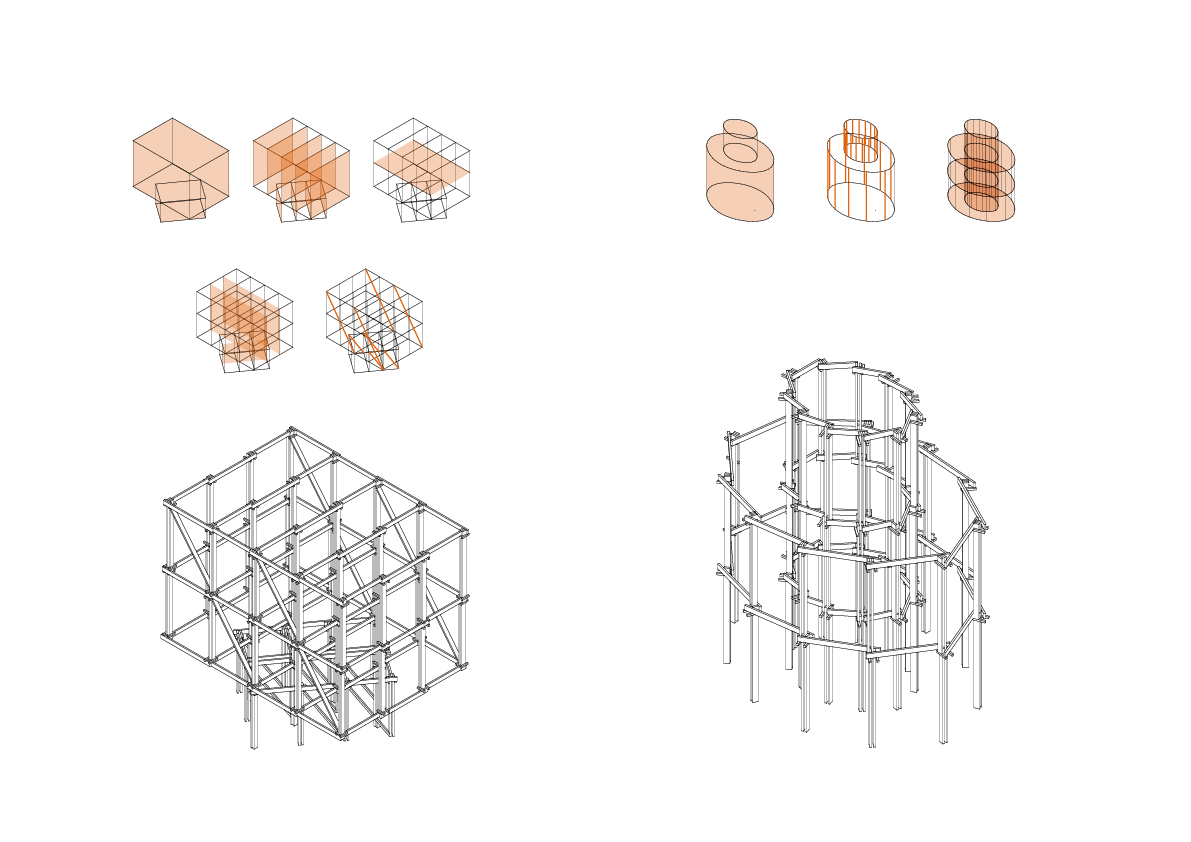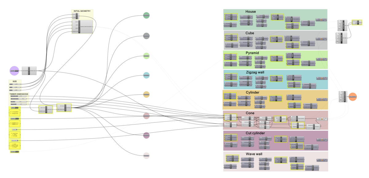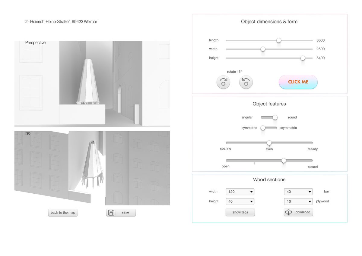 As a result of the work, a prototype of a program was created that allows the user to generate urban objects online using the Shapediver technology. Developed with the Grasshopper visual programming plugin for Rhinoceros, the initial algorithm is open source and structured. At the level of the architectural solution of the project, a constructive system was developed that solves the issues of connecting elements for different spatial configurations, preparing the assembling by users without experience, using various sections of timber elements. The user sets not only the main dimensions of the architectural object and its characteristics, but also the section of the available wooden beams and bars, and the thickness of the plywood from which the future object will be assembled.