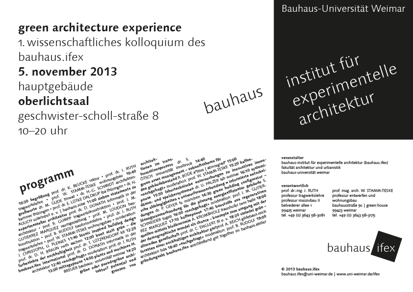 Am 5. November 2013 fand der offizielle Gründungsakt des bauhaus.ifex statt. Im Rahmen der ganztägigen Veranstaltung mit dem Thema "green architecture experience" wurden Vorträge und Diskussionsforen zu aktuellen Herausforderungen in Entwurfs-, Planungs- und Bauprozessen sowie zur adäquaten Bauteilentwicklung unter dem Aspekt demographischer und energetischer Wandlungen geboten. Das Programm der Veranstaltung kann hier heruntergeladen werden.