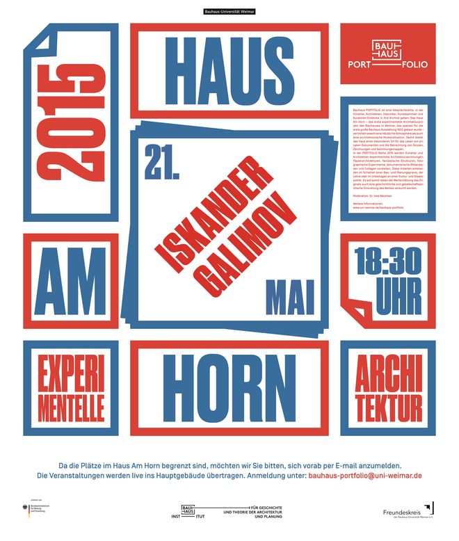 In dieser Veranstaltung der Bauhaus PORTFOLIO Gesprächsreihe wird Iskander Galimov, eine Auswahl seiner experimentellen Architekturzeichnungen zeigen, die er kurz nach seinem Studium am Moskauer Architektur-Institut (MARCHI) und während seiner Promotionsarbeit für Wettbewerbe, Ausstellungen Zeitschriftenumschläge und Poster zwischen 1987 und 1991 angefertigt hat. Viele seiner Arbeiten wurden gemeinsam mit der als ‚Papierarchitekten’ bezeichneten Gruppe von Architekturkritikern der Sowjetunion der 1980er ausgestellt. Iskander Galimov, der heute als Architekt in Wien tätig ist, wird an diesem Abend sowohl über seine Erfahrung der politischen Einengung der Architekturpraxis in der späten Sowjetunion und über seine persönliche Architekturanschauung sprechen.