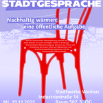 Am Mittwoch, 19. November 2025, um 18:00 Uhr, findet das nächste Weimarer Stadtgespräch unter dem Titel »Nachhaltig wärmen, eine öffentliche Aufgabe« statt.
