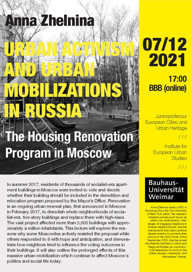 On the 7th of December 2021 at 17:00, Anna Zhelnina (Helsinki Institute of Urban and Regional Studies) will present her research on Urban activism and urban mobilizations in Russia: The Housing Renovation Program in Moscow within the European Cities course. The course is part of the Master's programme European Urban Studies and held by Jun.-Prof. Dr.-Ing. Daniela Zupan.