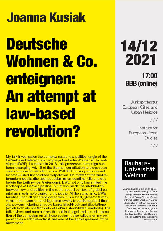 On the 21st of December 2021 at 17:00, Joanna Kusiak (Cambridge University & Humboldt University of Berlin) will give a talk about Deutsche Wohnen & Co. enteignen: An attempt at law-based revolution? within the European Cities course. The course is part of the Master's programme European Urban Studies and held by Jun.-Prof. Dr.-Ing. Daniela Zupan.
