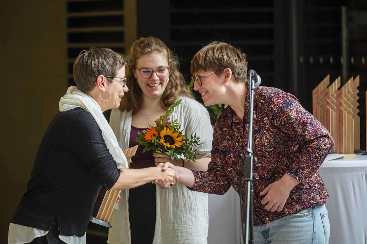 Ein besonderer Erfolg in diesem Jahr war ebenso die Verleihung eines der Sonderlehrpreise an drei Studierende der Fakultät Architektur und Urbanistik. Franziska Fischer, Jonas Hülsmann und Dorothea Margarethe Müller wurden für ihr Bauhaus.Modul „Wer Land schaf(f)t? Ein Ausflug in Thüringen auf der Suche nach den Produzent*innen von Landschaft“ ausgezeichnet. Ihr Erfolg beruhte auf der Verwendung abwechslungsreicher Lehrmethoden sowie der Behandlung relevanter und aktueller Themen, die Akteur*innen im ländlichen Raum in den Mittelpunkt stellten. Hervorzuheben ist, dass nicht nur Großstädte, sondern auch die Kleinstädte und Dörfer Thema der Lehre war und die interdisziplinäre Zusammenarbeit zwischen Architektur und Urbanistik besonders gewürdigt wurde.
