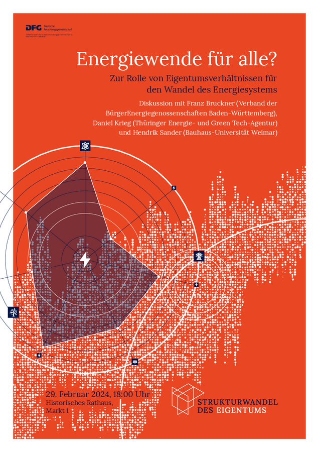 Hendrik Sander (Bauhaus-Universität Weimar), Franz Bruckner (Verband der Bürgerenergiegenossenschaften Baden-Württemberg) und Daniel Krieg (Thüringer Energie- und Green Tech-Agentur) werden der Frage nachgehen, welche Auswirkungen Veränderungen der Eigentumsstrukturen im Energiesektor auf das Gelingen der Energiewende haben.