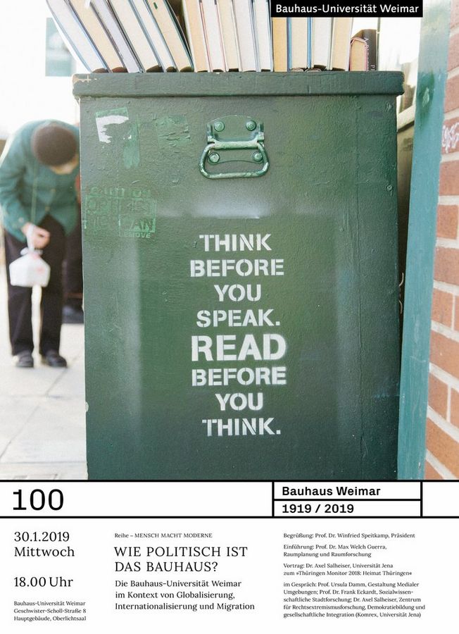 Am Mittwoch, 30. Januar 2019 um 18 Uhr, lädt die Bauhaus-Universität Weimar im Rahmen von »Mensch Macht Moderne« zu ihrer vorerst letzten Podiumsdiskussion der Veranstaltungsreihe in den Oberlichtsaal der Universität ein. Im Mittelpunkt der Diskussion steht die Frage, wie politisch das Bauhaus ist und welche Verantwortung der Bauhaus-Universität aus ihrem Erbe erwächst. Alle Interessierten sind herzlich eingeladen.