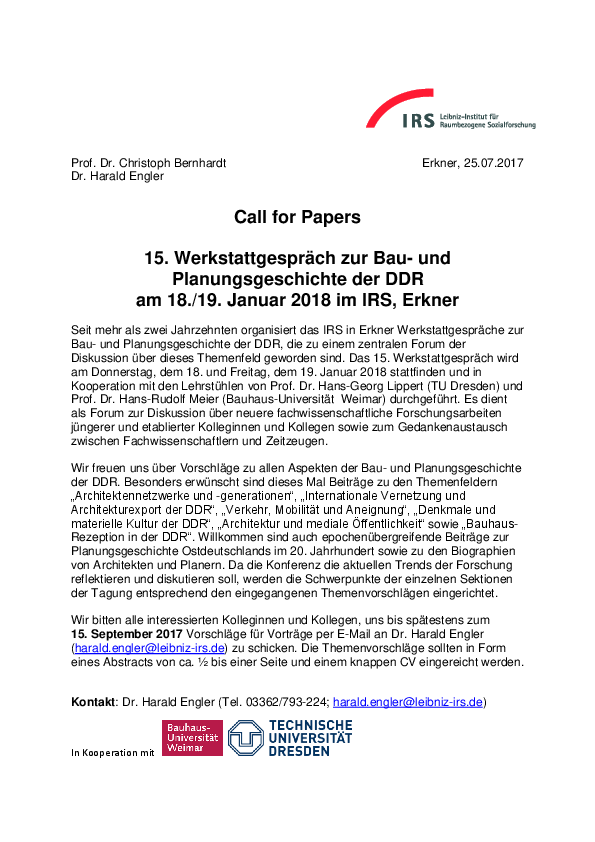 15. Werkstattgespräch zur Bau-und Planungsgeschichte der DDR am 18./19. Januar 2018 im IRS Erkner