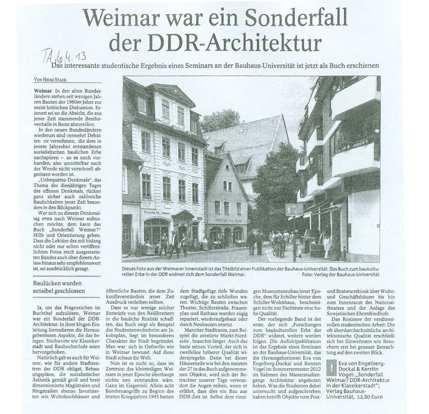 Am 6. April erschien in der Thüringer Allgemeinen eine Besprechung der vor kurzem veröffentlichten Publikation "Sonderfall Weimar? DDR-Architektur in der Klassikerstadt", herausgegeben durch Eva von Engelberg-Dockal und Kerstin Vogel.