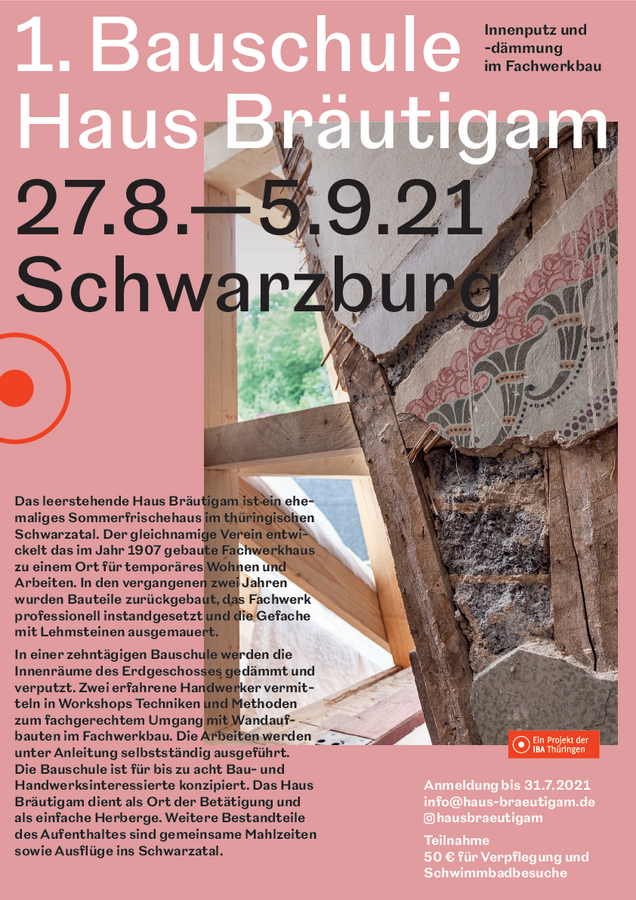 Das leerstehende Haus Bräutigam ist ein ehemaliges Sommerfrischehaus im thüringischen Schwarzatal. Der gleichnamige Verein entwickelt das im Jahr 1907 gebaute Fachwerkhaus zu einem Ort für temporäres Wohnen und Arbeiten. In den vergangenen zwei Jahren wurden Bauteile zurückgebaut, das Fachwerk professionell instandgesetzt und die Gefache mit Lehmsteinen ausgemauert.