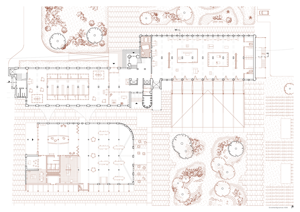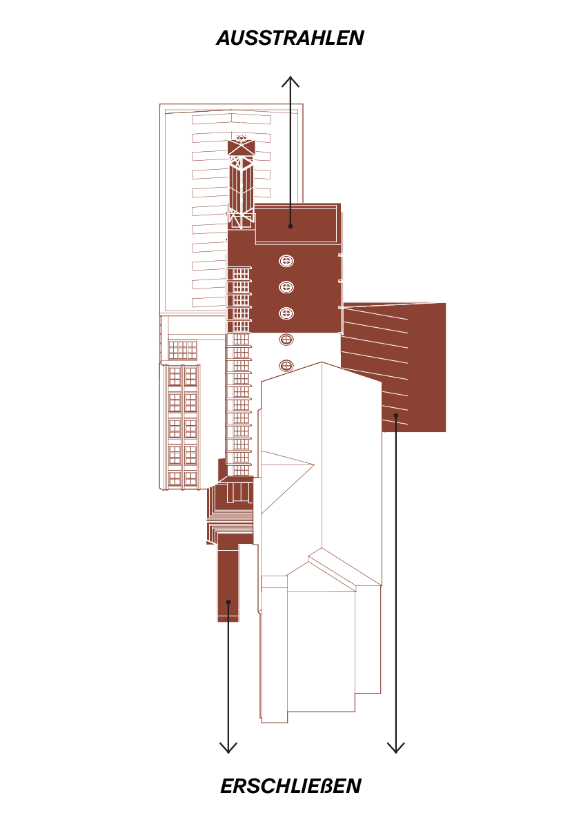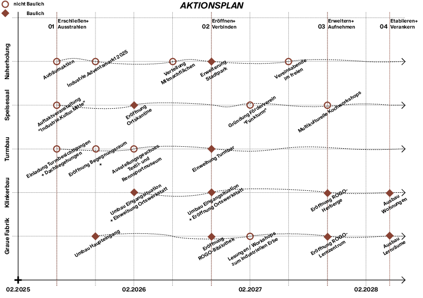 Als entwurfliches Gerüst wird neben inhaltlichen Grundsätzen ein Etappierungskonzept erstellt, um die Arealentwicklung schrittweise zu fördern und ggf. auf Bedarfsänderungen reagieren zu können. Zunächst soll das leerstehende Gebäude erlebbar und zugänglich gemacht werden. Der pragmatische Ansatz startet mit der Erschließung: Das tiefer liegende Erdgeschoss erhält auf beiden Seiten barrierefreie Zugänge. Niederschwellige Raumangebote für gemeinschaftliche Nutzung machen den bisher isolierten Turm erlebbar und geben den ersten Anstoß für die weitere Entwicklung.