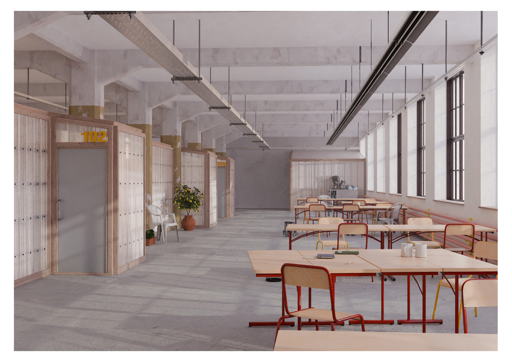 Im ersten Obergeschoss wird das Raumprogramm erweitert: In der "Grauen Fabrik" entsteht eine Sprachschule, die ein neues Bildungsangebot schafft und gleichzeitig neue Besucher*innengruppen nach Oberlungwitz zieht. Ergänzend wird eine Herberge für Kurzaufenthalte eingerichtet. Es entstehen Warm- und Kalträume, die nach Bedarf beheizt werden können. Je nach Bedarf können die oberen Geschosse mit flexiblen Wohnungen ausgestattet werden, die im Gegensatz zur Herberge eine dauerhafte Belebung des Areals fördern. Eine Außentreppe an der Stirnseite der Roten Fabrik bildet eine eigene Adresse für die Anwohner*innen und wird zum sichtbaren äußeren Zeichen der Transformation. Die neue, beleuchtbare Turmkonstruktion strahlt als Symbol des Wandels in die Region.