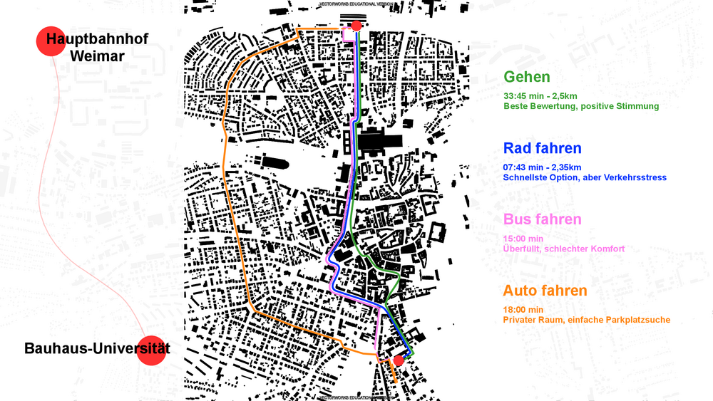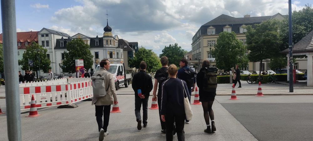 Am Donnerstag, den 22. Mai 2025, trafen sich die Studierenden um 15:15 Uhr am Weimarer Hauptbahnhof zu einem besonderen Feldstudium. Gemeinsam mit Pascal Cornips von Benthem Crouwel Architects erkundeten sie in vier Gruppen die Strecke vom Bahnhof zur Bauhaus-Universität – jede Gruppe mit einem anderen Verkehrsmittel: zu Fuß, mit dem Fahrrad, mit dem Bus und mit dem Auto.
