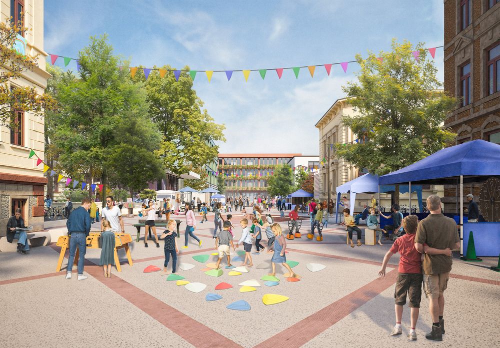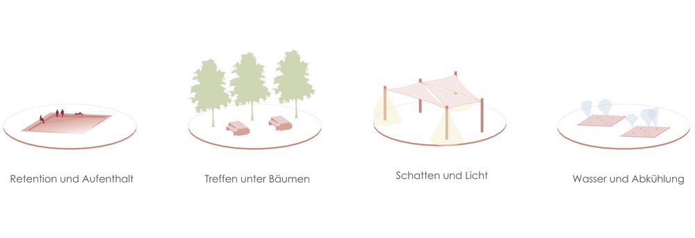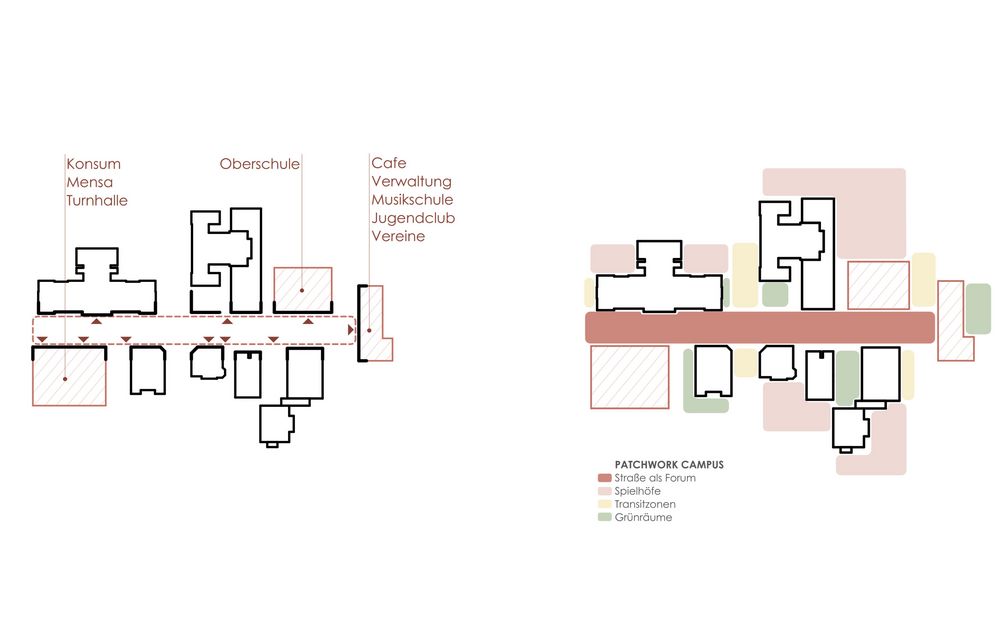 Der Entwurf organisiert den Bildungsstandort neu, indem die Bachstraße vom Verkehrsraum zum gemeinsamen Forum für Schule und Nachbarschaft transformiert wird. Durch Verkehrsberuhigung entsteht ein linearer Freiraum, der als offener Campusraum funktioniert und Begegnung im Alltag ermöglicht.