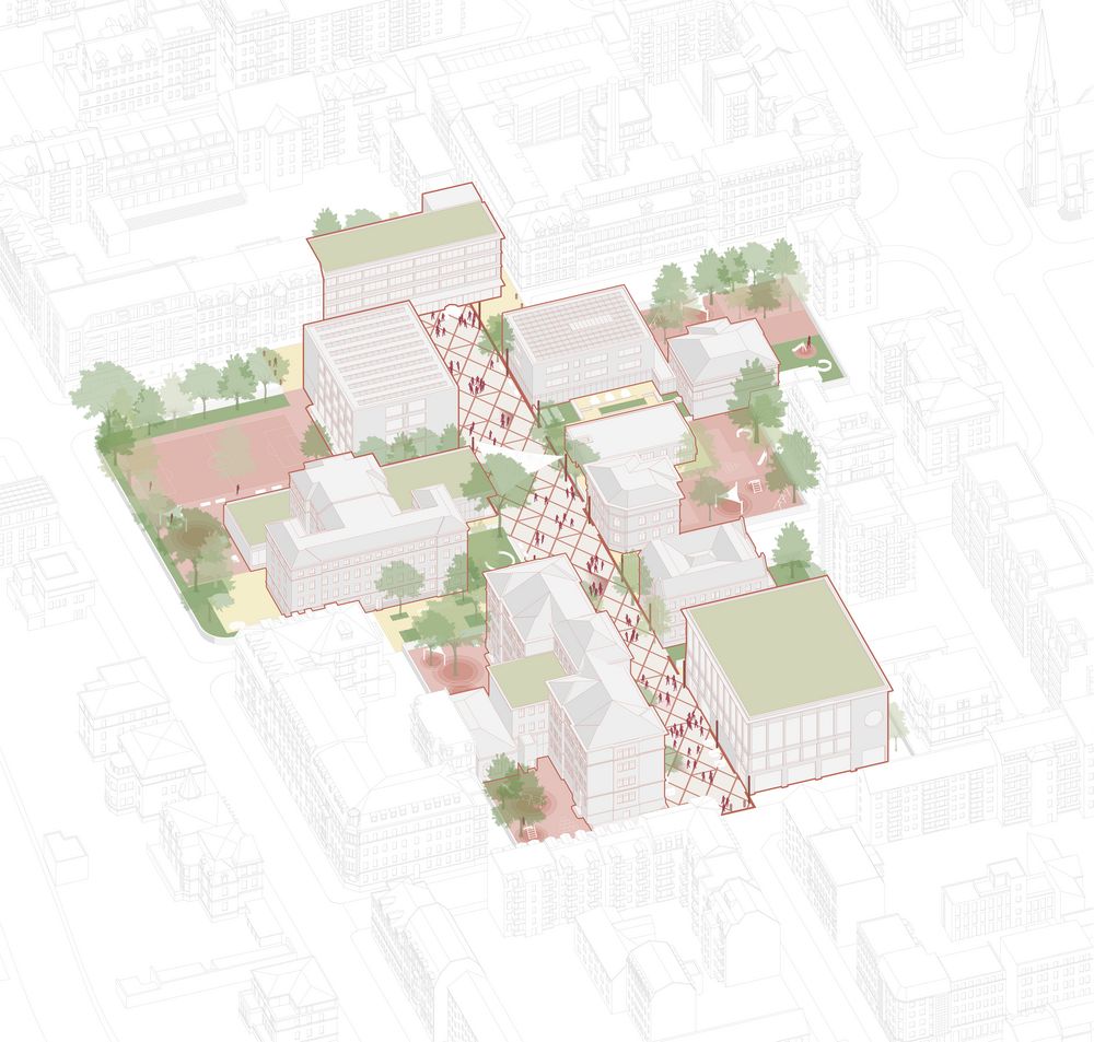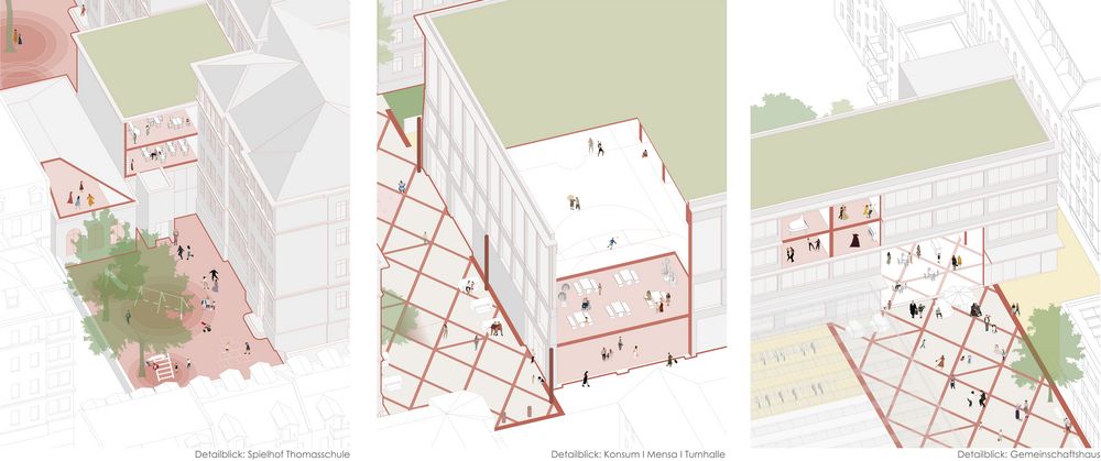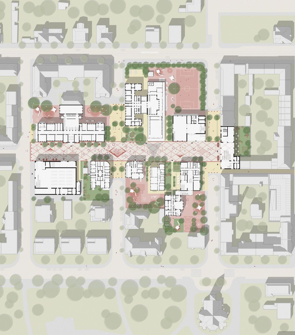 Die Straße bildet das räumliche und soziale Rückgrat des Ensembles. Eingänge orientieren sich zur Bachstraße, Nutzungen werden sichtbar und der öffentliche Raum wird zum zentralen Ankunfts- und Aufenthaltsort. Ergänzend entsteht ein abgestuftes Freiraumsystem: öffentliche Zonen entlang der Straße, geschützte Schulhöfe im Inneren und grüne Rückzugsräume. So verbinden sich urbane Offenheit und pädagogische Geborgenheit.