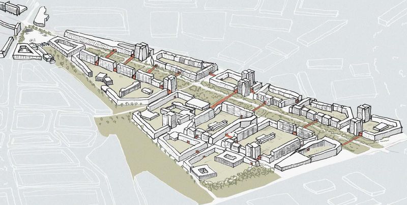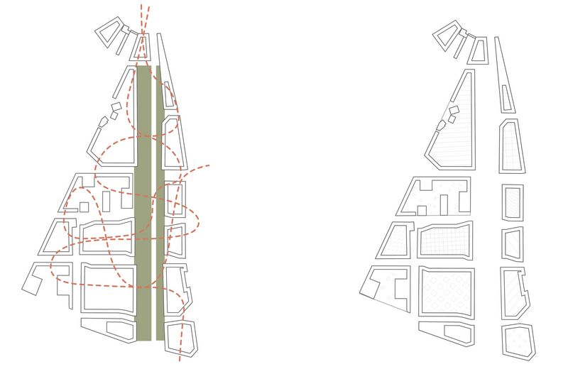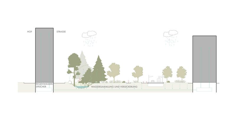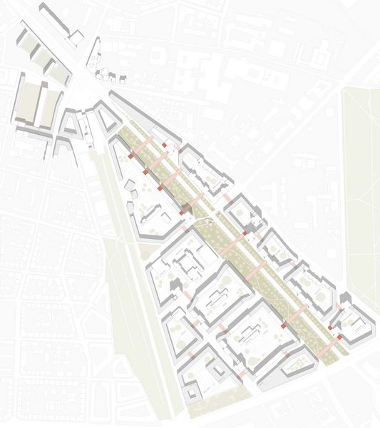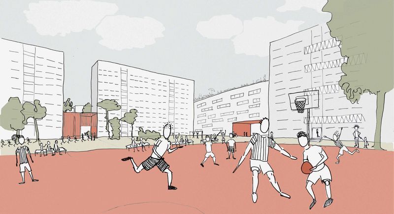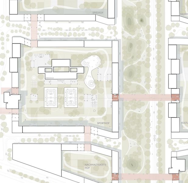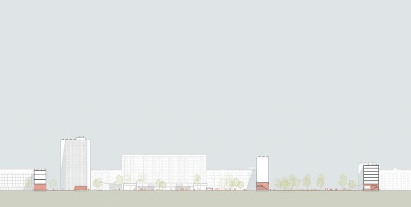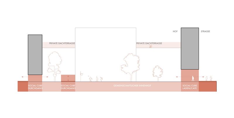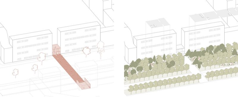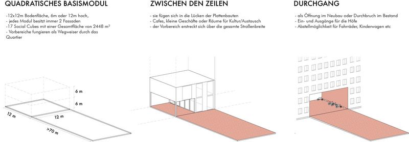 Der Entwurf bildet eine strukturelle Verschmelzung von Blockrand und Plattenbau durch Ergänzung der bestehenden Gebäude mit Neubauten. Im Vergleich zu den dichten Gründerzeitblöcken in der unmittelbaren Umgebung bieten die neuen geräumigen Höfe Außenraumaktivitäten für die Nachbarschaft. Ergänzt wird das Angebot durch kleine öffentliche Kuben zwischen den Plattenbauten: die sogenannten „Social Cubes“. Diese fungieren als Mediatoren zwischen Höfen und Straße und sind zudem Teil eines fußgängerfreundlichen Wegenetzes durch das Quartier. Die 90 Meter breite Straße wird auf zwei Autospuren reduziert und um eine neue Fahrradstraße und Straßenbahnlinie ergänzt. Die Parkplätze werden entfernt und nun zugunsten der Biodiversität und des Stadtklimas zu einem wilden Grünstreifen, der zum Spazieren und Verweilen einlädt. Re:modern ist die Transformation der Ideale der Moderne in das Zeitalter der Nachhaltigkeit. Die positiven Seiten der Moderne bleiben bestehen und werden durch Ideen für die Zukunft ergänzt.