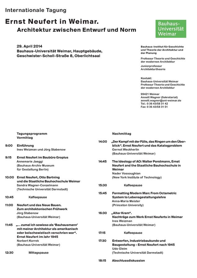 Ernst Neufert gehört zu jenen Akteuren der modernen Architekturgeschichte, die aus einer Position in der zweiten Reihe der Avantgarde eine besonders einflussreiche Wirkung entfalteten. Vom 2. April bis 4. Mai 2014 zeigt die Bauhaus-Universität Weimar die Doppelausstellung „Ernst Neufert. Leben und Werk des Architekten 1900-1986 / Einblicke in das Privatarchiv“. Begleitend zur Ausstellung veranstalten die Professur Theorie und Geschichte der modernen Architektur und die Juniorprofessur Architekturtheorie am 29. April 2014 die Tagung „Ernst Neufert in Weimar. Architektur zwischen Entwurf und Norm“.