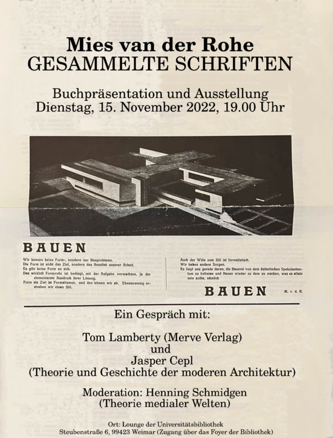 Tom Lamberty präsentiert die Gesammelten Schriften Mies van der Rohes in der Universitätsbibliothek der Bauhaus-Universität Weimar. Er gibt Auskunft über den Ablauf der umfangreichen Recherchen und erläutert die Prinzipien der Edition. Im Gespräch mit Jasper Cepl, Professor für Theorie und Geschichte der modernen Architektur, diskutiert er die Aktualität der Schriften Mies van der Rohes. Eine Vitrinenausstellung zeigt Erstausgaben und rare Drucke aus den Beständen der Universitätsbibliothek.