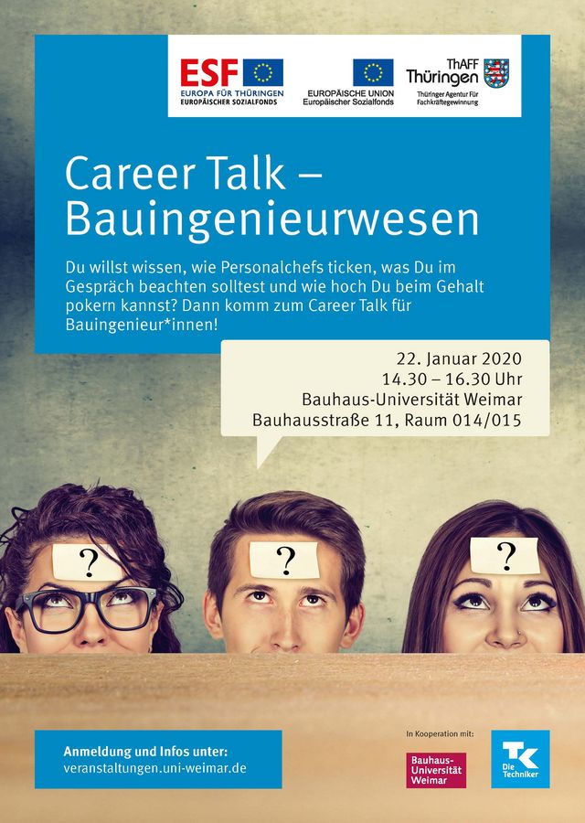 Am Mittwoch veranstaltet der Career Service der Bauhaus-Universität Weimar zusammen mit der Thüringer Agentur für Fachkräftesicherung und der Techniker Krankenkasse einen Career Talk für Studierende der Fakultät Bauingenieurwesen. Sechs Unternehmen aus der Region beantworten Fragen zu den Themen Bewerbung , Gehaltsverhandlung und Bewerbungsgespräch. Um Anmeldung wird gebeten.