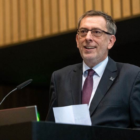 Vor hochrangigen Vertreterinnen und Vertretern aus Politik, Automobilindustrie und Forschung stellte Professor Plank-Wiedenbeck aktuelle Erkenntnisse des Bauhaus-Institutes für zukunftsweisende Infrastruktursyteme (b.is) vor.