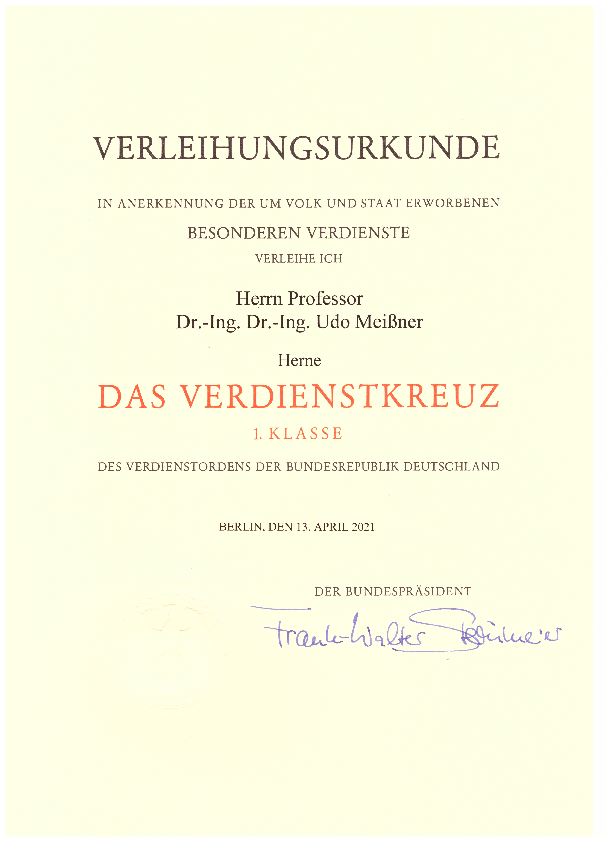 Am Freitag, 5. November 2021, überreichte Hessens Wirtschaftsstaatssekretär Dr. Philipp Nimmermann die vom Bundespräsidenten Frank-Walther Steinmeier bereits im April 2021 verliehene Auszeichnung auf der Mitgliederversammlung der Ingenieurkammer Hessen: »Sie haben sich stets unermüdlich für die Fortentwicklung des Ingenieurwesens, die Belange des Berufsstands und insbesondere für den Ingenieurnachwuchs eingesetzt und durch Ihre Motivation, Ihre Kompetenz und Ihr Engagement viele Menschen bewegt und inspiriert«, sagte Nimmermann in seiner Laudatio.