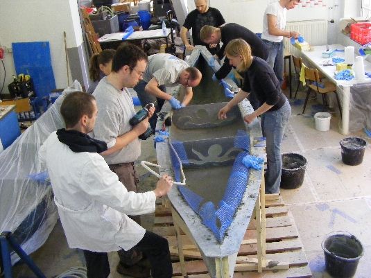 Insgesamt 19 Studierende aus den Fakultäten Bauingenieurwesen und Architektur der Bauhaus-Universität Weimar haben in wochenlanger Arbeit an den Kanus getüftelt, Proben gegossen und Betonrezepturen getestet. Schließlich galt es, die ideale Form und das passende Gewicht für die Boote zu finden. Denn darin liegt die wissenschaftliche Herausforderung der sportlichen Regatta: Beton zum Schwimmen zu bringen. Das Weimarer Team hat sich in diesem Jahr für eine kurze und schmale Variante entschieden: Die Betonboote sind etwa 4,60 Meter lang, wiegen weniger als 50 Kilogramm und weisen eine Wandstärke von nur ca. 5 mm auf.