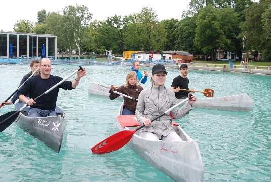 Insgesamt 20 Studierende aus der Fakultät Bauingenieurwesen, Architektur und Gestaltung der Bauhaus-Universität Weimar haben seit Oktober 2014 an den Kanus getüftelt, Proben gegossen, Betonrezepturen und Strömungsverhalten getestet. Oberstes Ziel war es, die optimale Betonmischung und die ideale Form für die Boote zu finden. Denn darin liegt die wissenschaftliche Herausforderung: Beton zum Schwimmen zu bringen und möglichst leichte aber dennoch stabile und wendige Boote zu entwickeln, die sich gut steuern lassen.