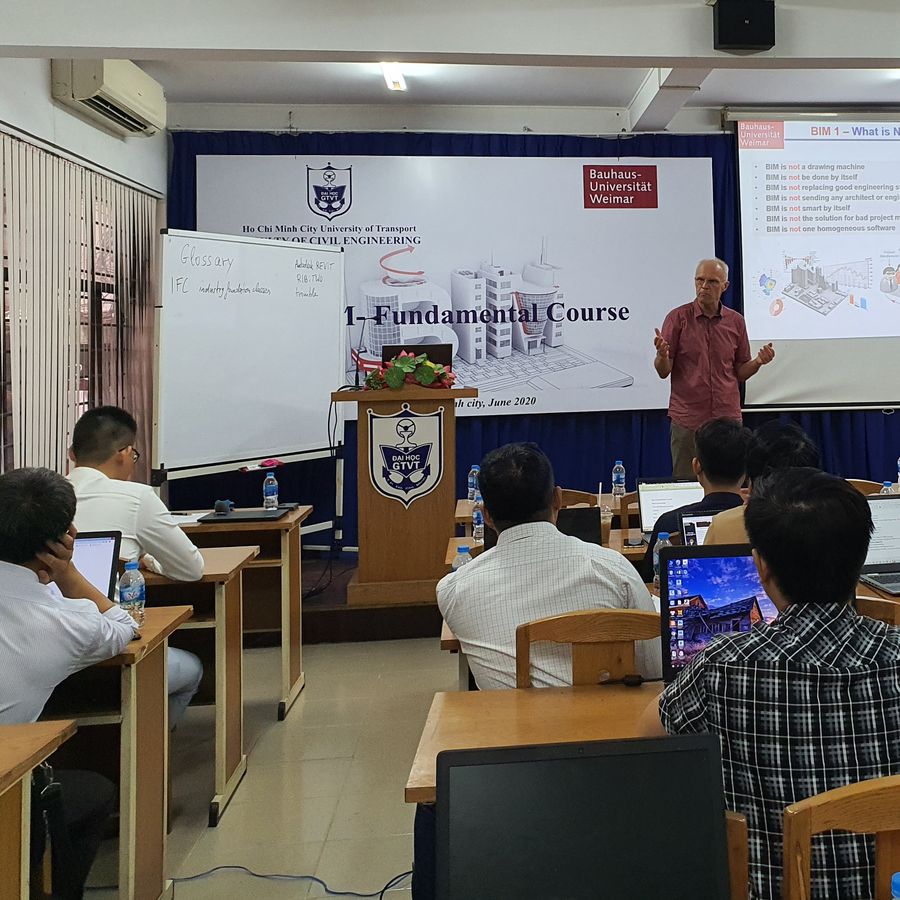 An meiner Partneruniversität, der HCMC University of Transport, habe ich im Mai einen mehrtägigen BIM-Kurs durchgeführt – zusammen mit einem hervorragenden vietnamesischen Bachelorabsolventen, der den Laborteil übernommen hat, also die Hands-on Einweisung in die Softwareprogramme, das Üben von Modellierungen, das Abfragen von Informationen aus dem Modell, die Datenübergabe oder das Clash Detection.
