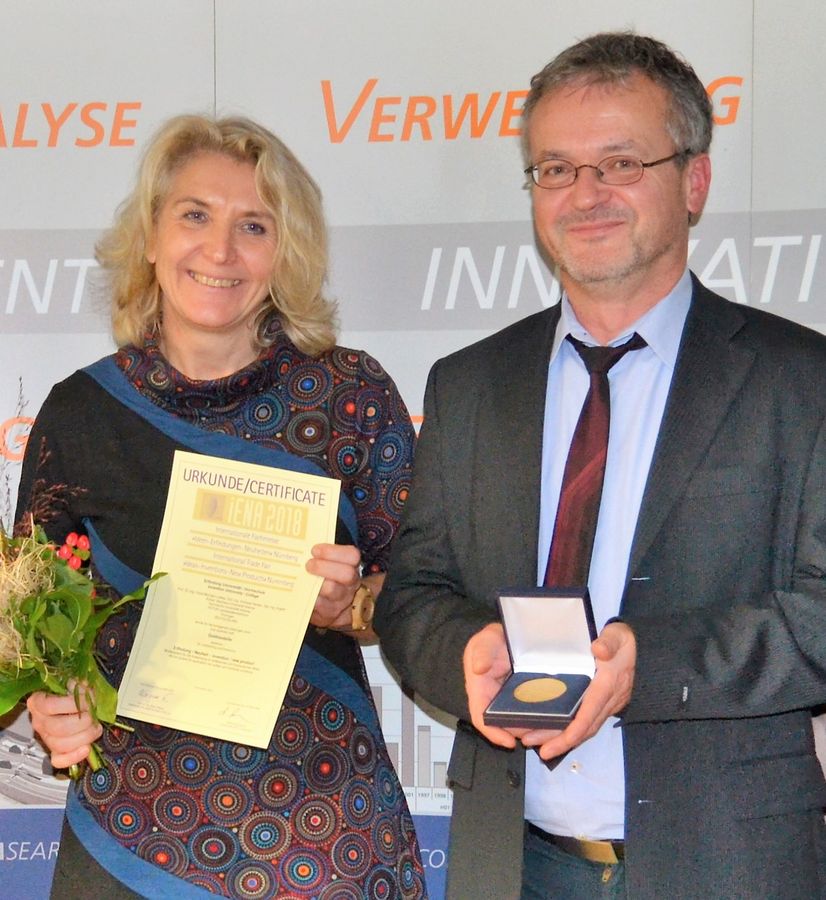 Die Erfinder- und Neuheitenausstellung iENA findet seit 1948 in Nürnberg statt. Innovationen von Thüringer Universitäten werden vor Ort vom Landes Patentzentrum Thüringen (PATON) vertreten. 2018 wurden insgesamt 15 Medaillen, darunter 9 Goldmedaillen, an Thüringer Innovatoren und Forschende überreicht. Neben der Goldmedaille zum Patent »Universelles Mörtelsystem für die Anwendung im sulfatischen und hydraulischen Milieu« erhielten die Weimarer Erfindungen »Seismische Tomographie zur Detektion von Staumauerschäden« (Prof. Dr. rer. nat. Tom Lahmer, M.Sc. Muyiwa Alalade, Prof. Dr.-Ing. Frank Wuttke) sowie »Ultraschall Beton- und Mörtelmischer« (M.Sc. Ricardo Remus, Dr. Christiane Rößler, Prof. Dr.-Ing. Horst Michael Ludwig) eine Ehrenurkunde.