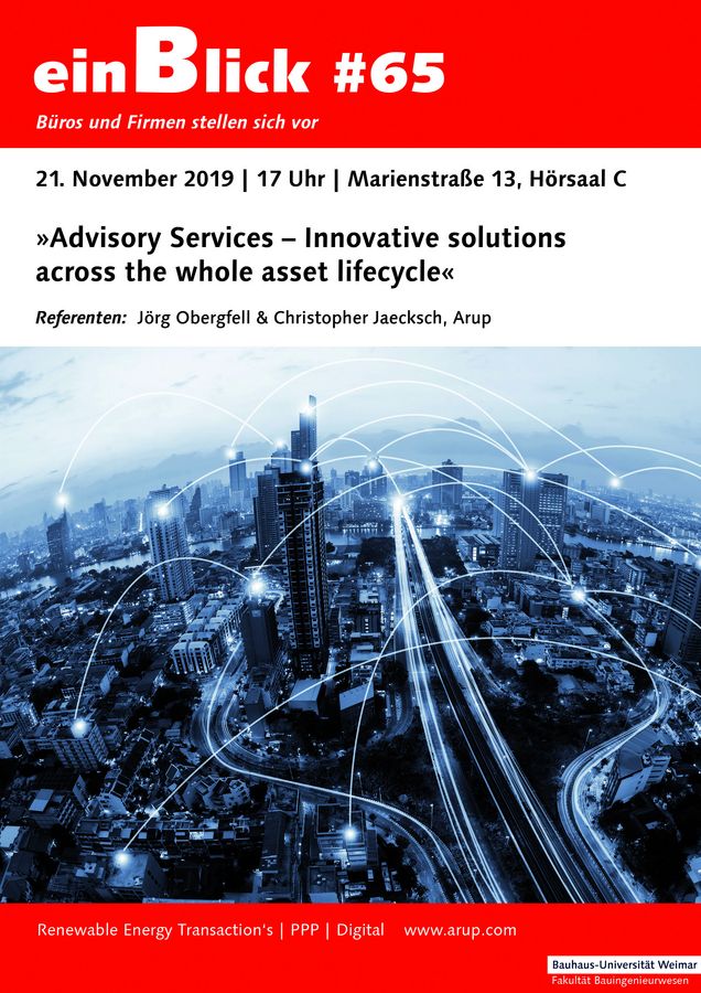 Im Rahmen der einBlick-Vortragsreihe stellen Jörg Obergfell und Christopher Jaecksch am kommenden Donnerstag, den 21. November 2019, das international tätige Planungs- und Beratungsunternehmen Arup vor. Interessierte sind herzlich um 17 Uhr in die Marienstraße 13, Hörsaal C, eingeladen.