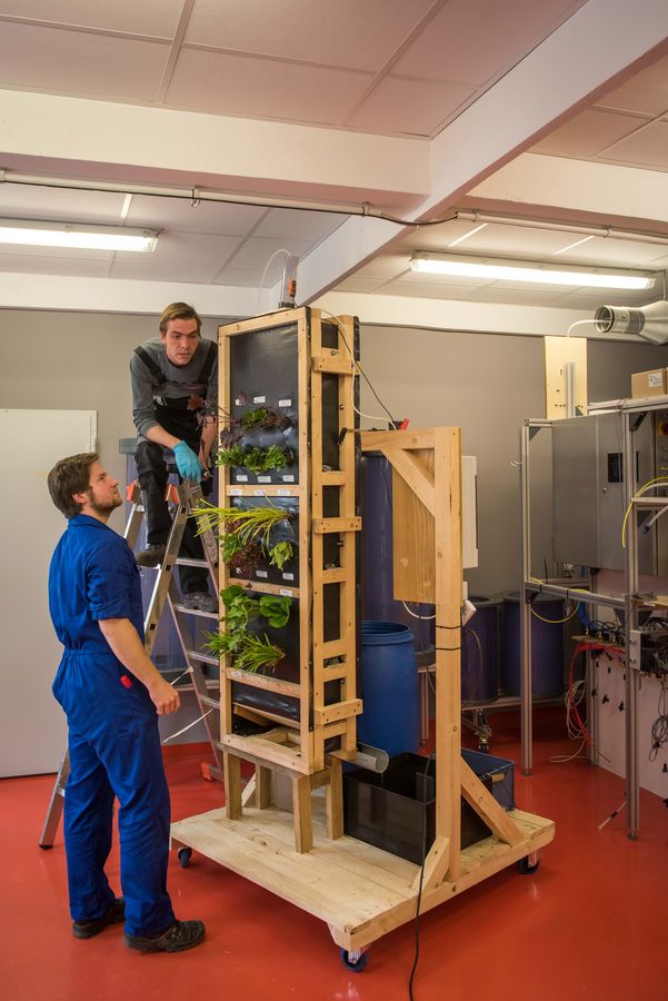 Anspruchsvoll war auch die Auswahl der eingesetzten Pflanzen, so der Master-Student. So müssen die Pflanzen winterhart sein und ohne Erdsubstrat in ständiger Feuchtigkeit vertikal gedeihen können. Dabei konnten sich die drei Männer nur auf wenige Erfahrungswerte in der Literatur verlassen. Die Wahl fiel auf Stauden, Gräser und Kräuter von einem Biostaudenversand. Die Pflanzen dienen dabei nicht nur der Begrünung der Fassade, sondern verbessern durch die Verdunstung von Wasser, sowie Luftaustrag über die Blätter auch das Mikroklima. Dadurch, so Andreas, entsteht nicht nur ein ästhetischer, sondern auch ein ökologischer Nutzen.